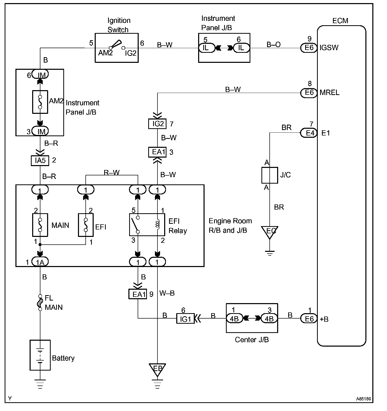 CIRCUIT DESCRIPTIONWhen the ignition switch is turned ON, the battery positive voltage is applied to the coil which closes the contacts of the EFI relay (Marked: EFI) and supplies power to terminal +B of the ECM.