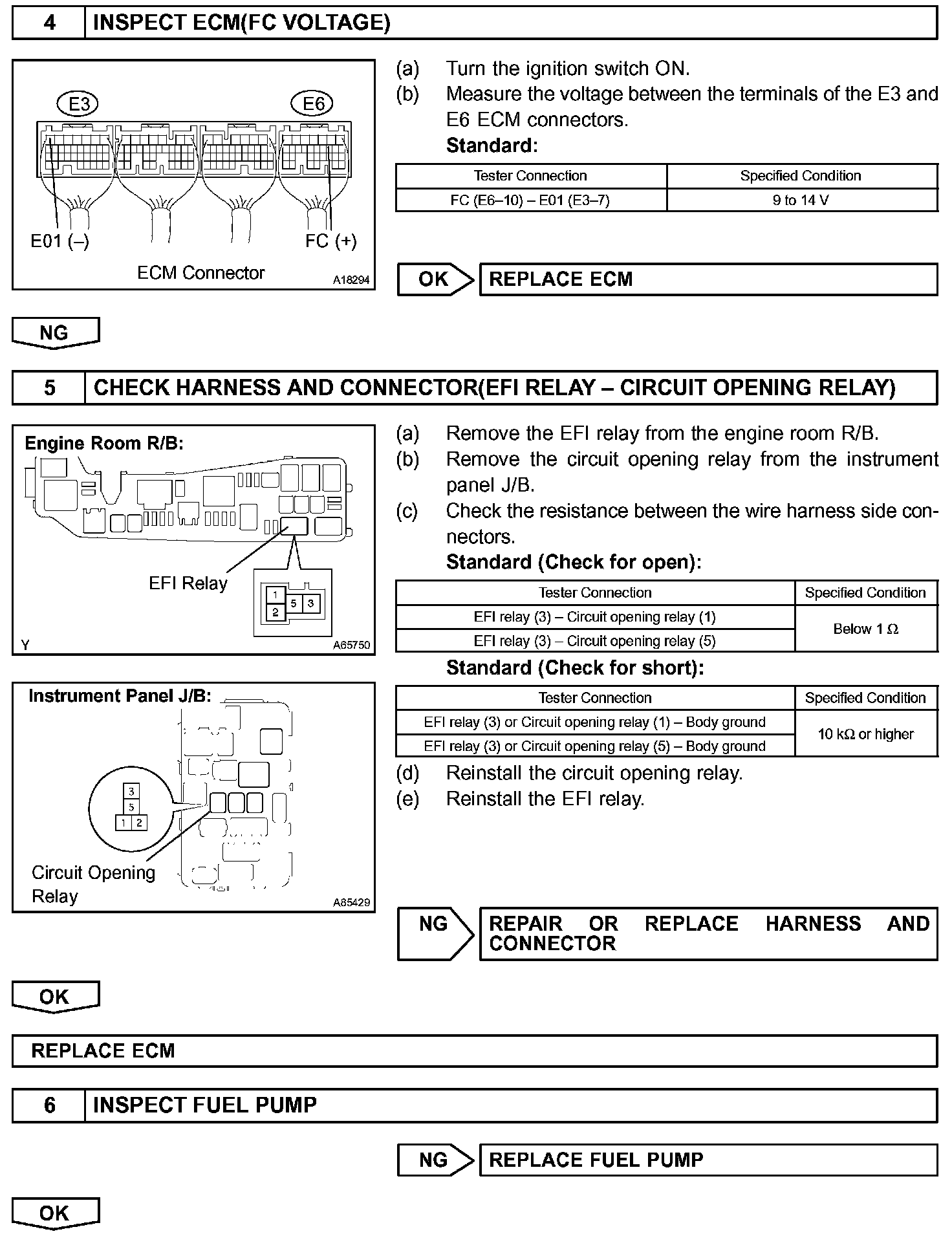 When the STA signal and NE signal are input to the ECM, Tr is turned ON, current flows to the coil of the circuit opening relay (marked: C/OPN), the relay switches on, power is supplied to the fuel pump and the fuel pump operates.