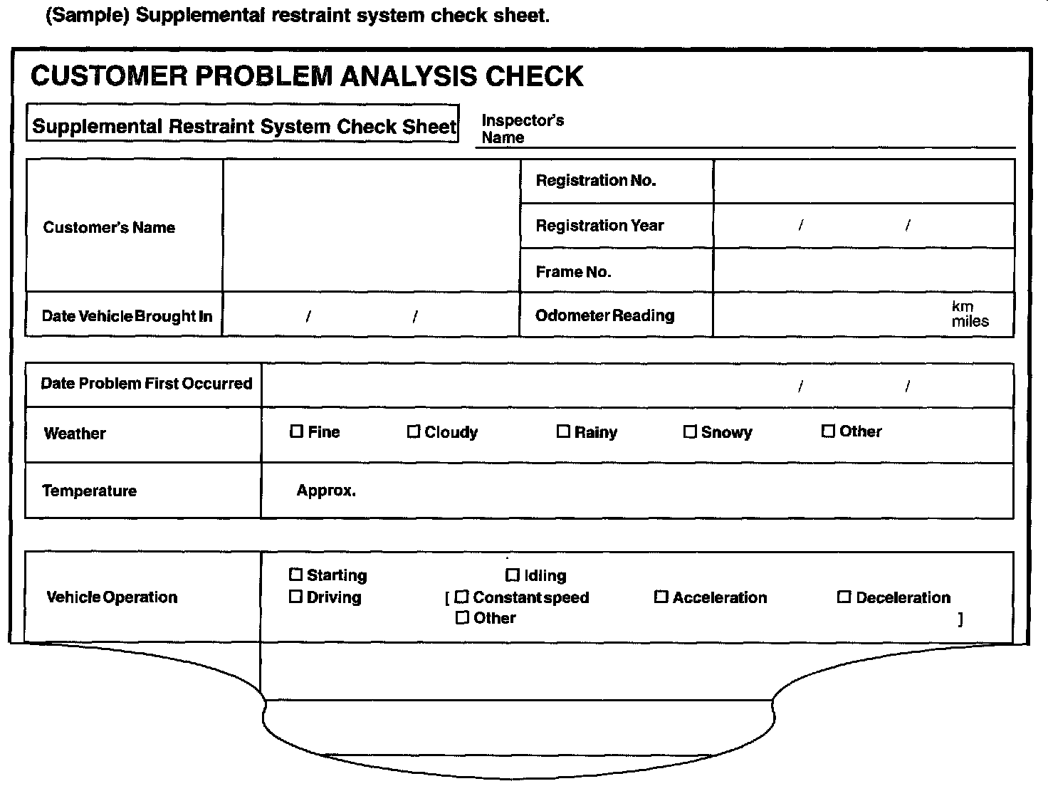 - The following 5 items are important points in the problem analysis. Past problems which are thought to be unrelated and the repair history, etc. may also help in some cases. So, as much information as possible should be gathered and its relationship with the problem symptoms should be correctly ascertained for a reference in troubleshooting. A customer problem analysis table is provided in the applicable diagnostics section for each system for your use.