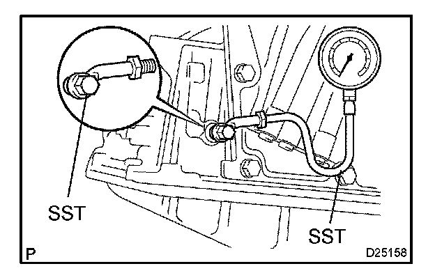 2. Remove the test plug on the transaxle case front left side and connect SST.
