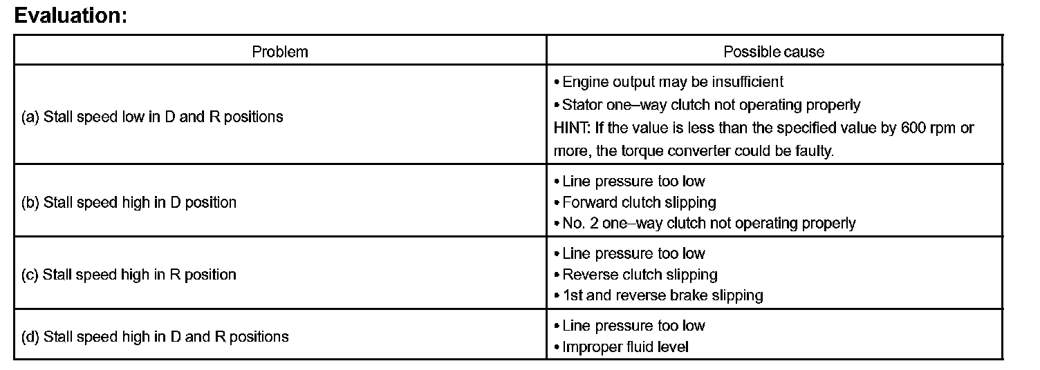 The object of this test is to check the overall performance of the transaxle and engine by measuring the stall speeds in the D and R positions.