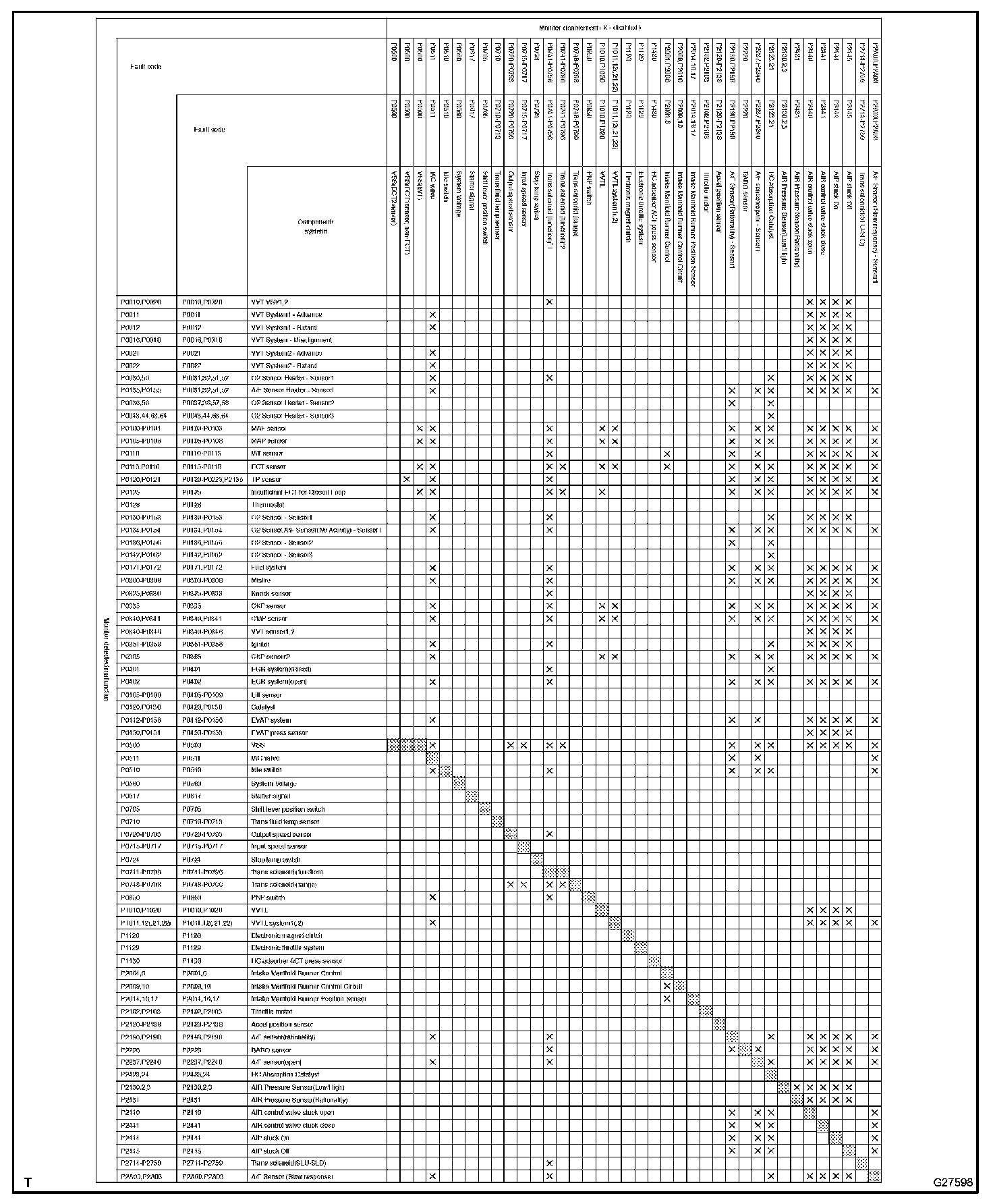 The table indicates ECM monitoring status for the items in the upper columns if the DTCs in each line on the left are being set.
