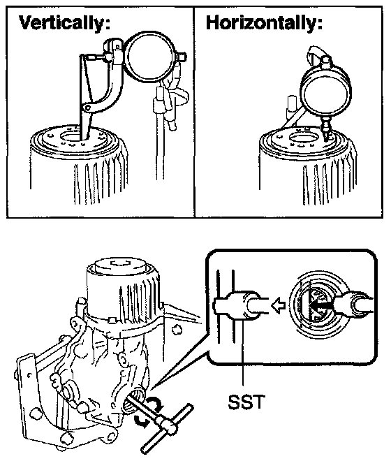 b. Using SST and a dial indicator, measure the runout of the transmission coupling horizontally.