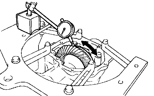 a. Place a dial indicator on the teeth surface on the ring gear vertically, check with fixing the driven pinion and moving the ring gear.