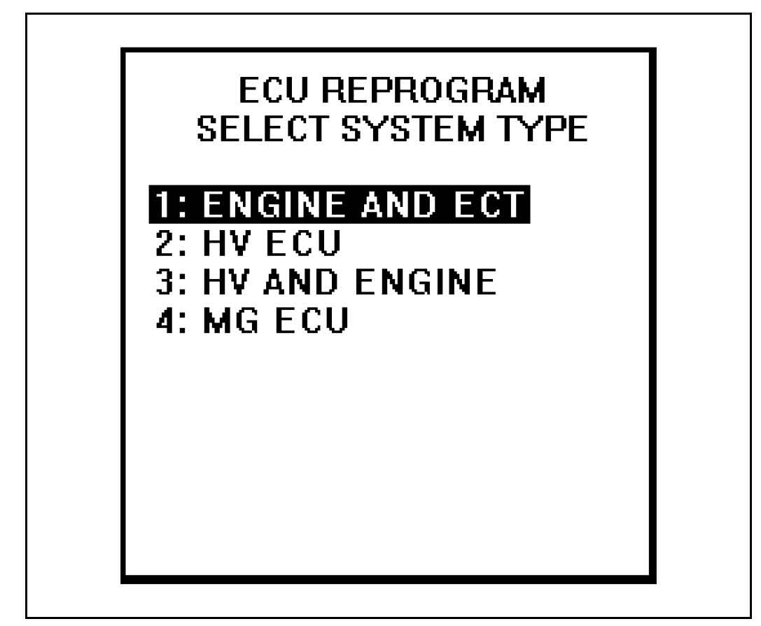 (h) Select "1. ENGINE AND ECT" from the "ECU REPROGRAM SELECT SYSTEM TYPE" menu.