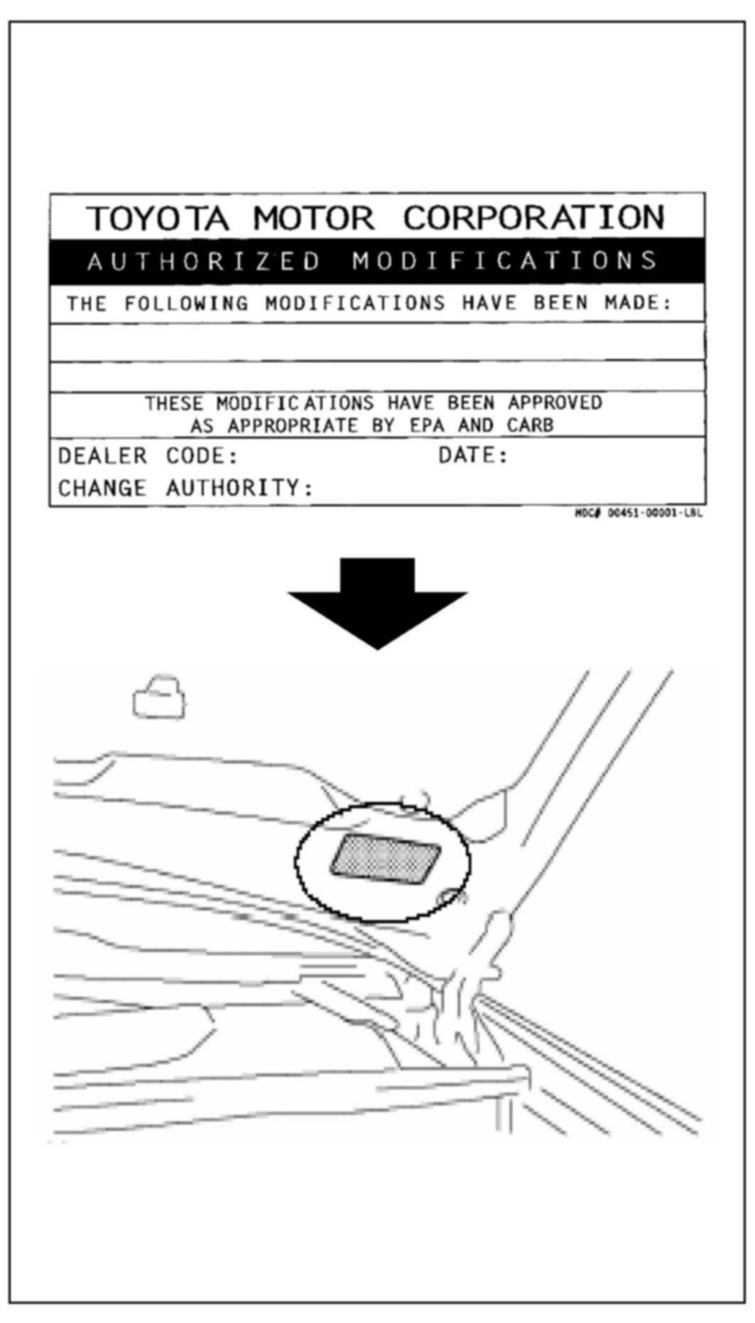 (b) Install the Recalibration Label on the underside of the hood in front of the driver (see illustration).