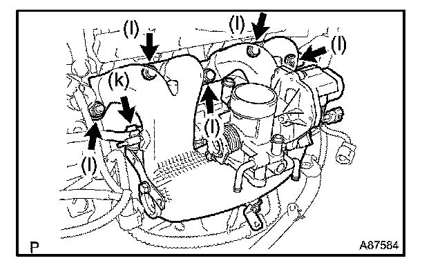l. Remove the 3 bolts and 2 nuts, then remove the intake manifold.