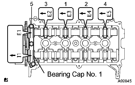 Check the front marks and numbers on the bearing caps No. 1 and No. 2, then tighten the bolts uniformly in several steps in the sequence shown in the illustration.