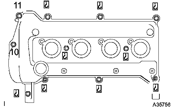 Temporarily tighten the 9 bolts and 2 nuts on the cylinder head cover.