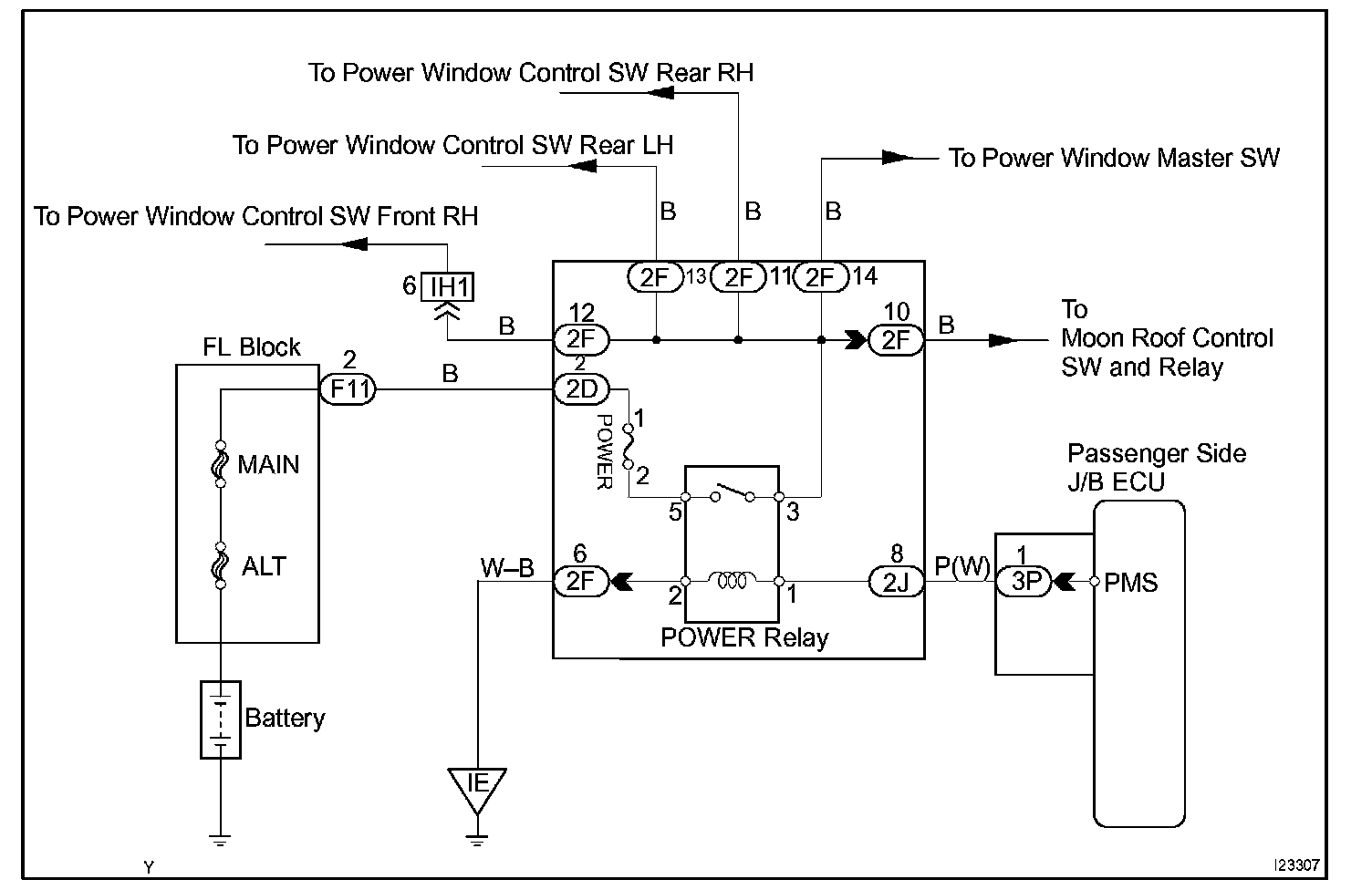 Power main relay (Marking: POWER) will be ON by operating the power window switch.