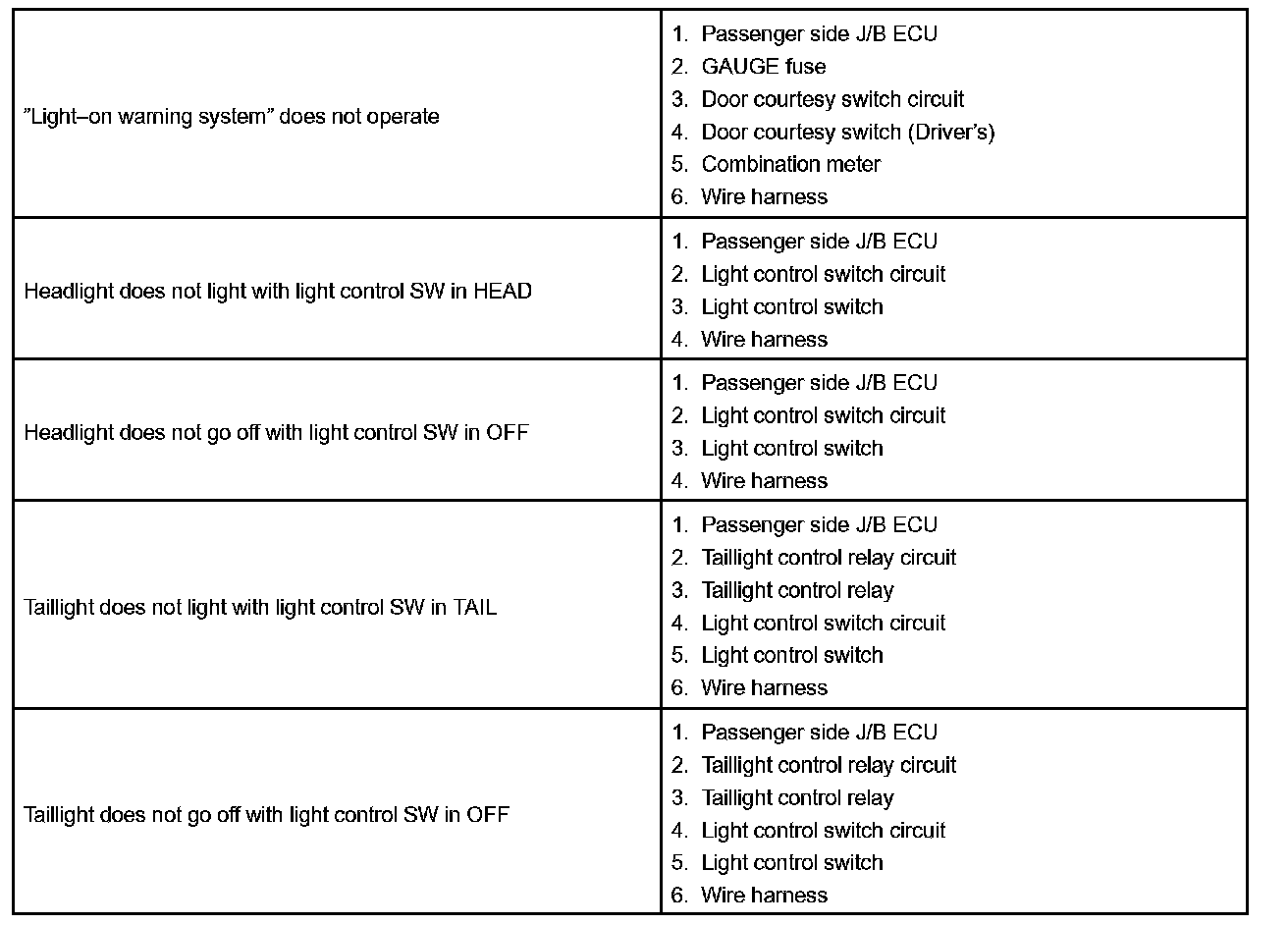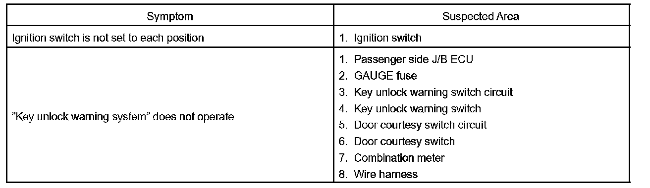 PROBLEM SYMPTOMS TABLEIGNITION SWITCH AND KEY UNLOCK WARNING SWITCH: