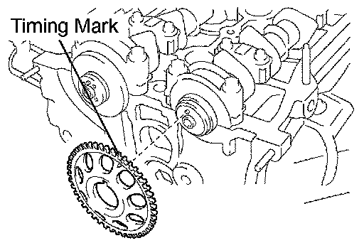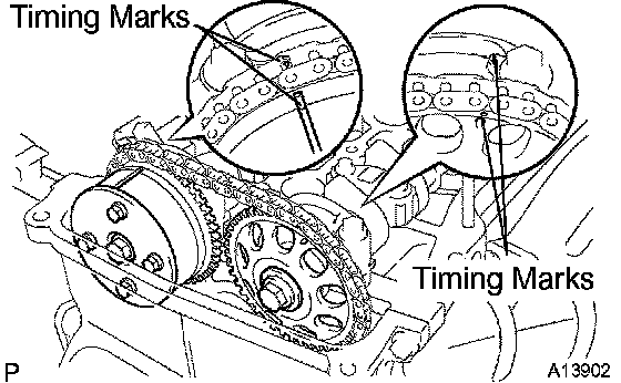 a. Turn the hexagonal wrench head portion of the camshafts, and align the timing marks of the camshaft timing sprocket and VVT timing sprocket with the timing marks of No 1 and No. 2 bearing caps as shown in the illustration.