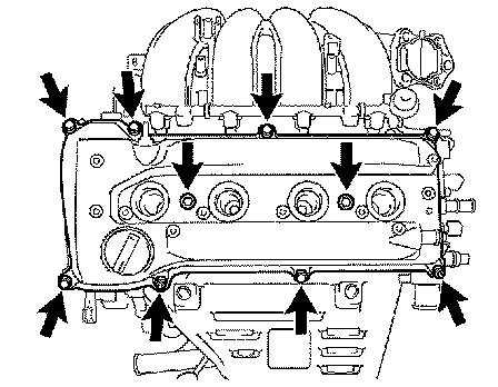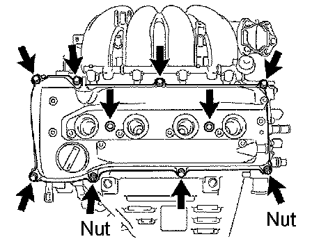 b. Remove the 8 bolts, 2 nuts, cylinder head cover and gasket.