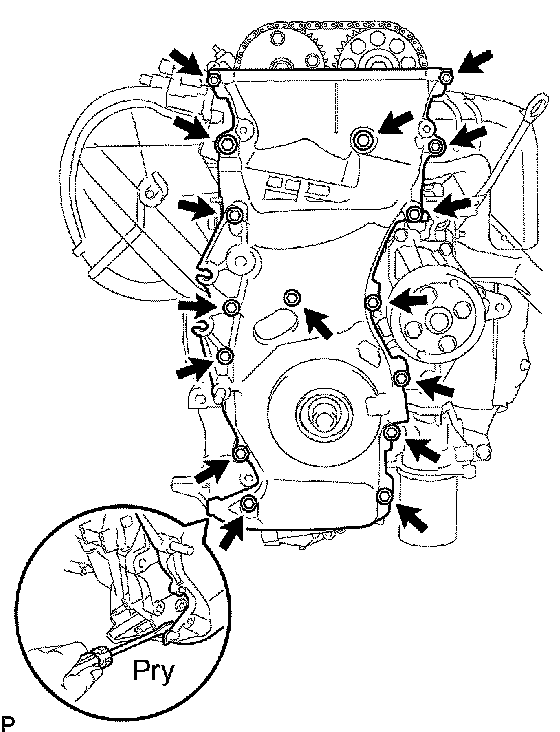 c. Using a screwdriver, pry between the timing chain cover and cylinder head or cylinder block.