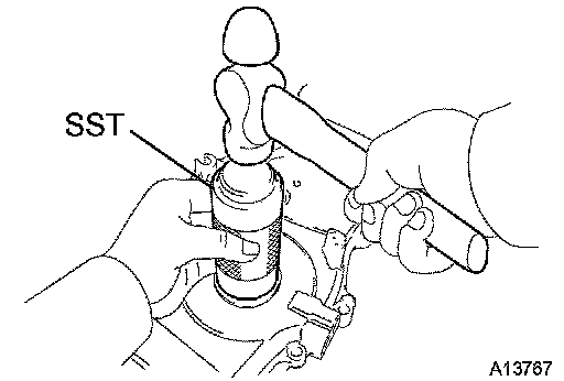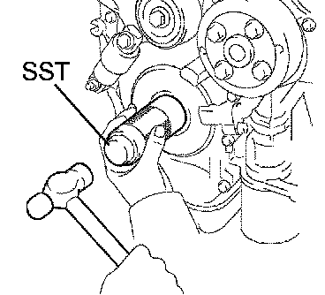 2. Using SST and a hammer, tap in a new oil seal until its surface is flush with the timing chain cover edge.