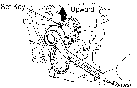 b. Using the crankshaft pulley bolt, turn the crankshaft and set the set key on the crankshaft upward.