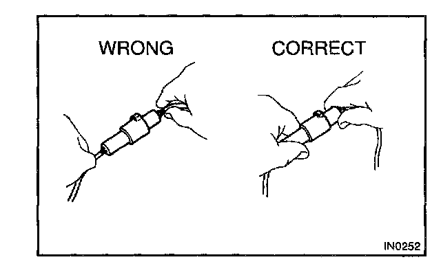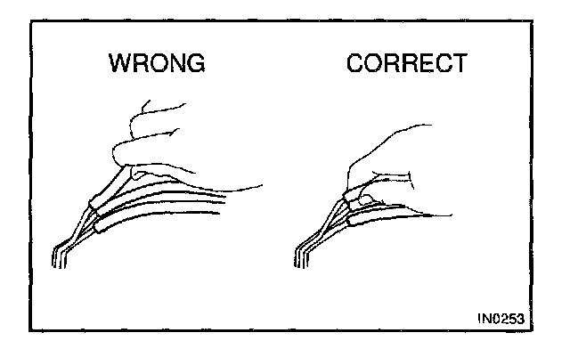 7. When checking continuity at the wire connector, insert the tester probe carefully to prevent terminals from bending.