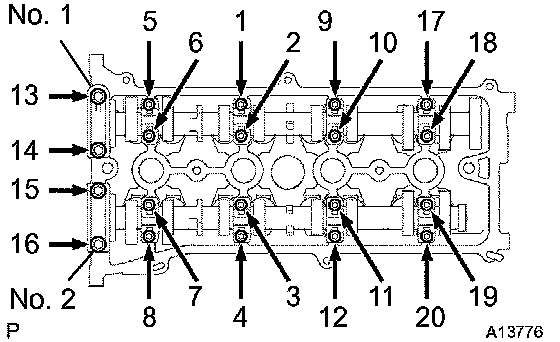 Install and uniformly tighten the 20 bearing cap bolts in several passes, in the sequence shown.