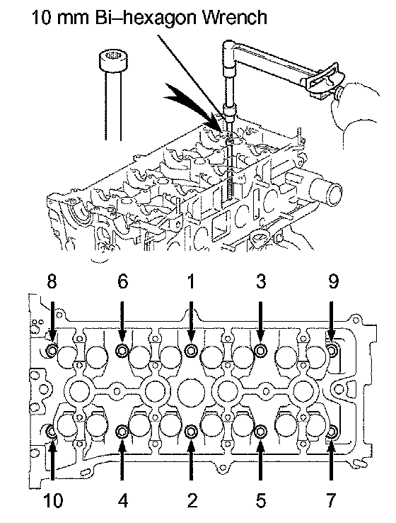 Using a 10 mm bi-hexagon wrench, uniformly loosen and remove the 10 cylinder head bolts in several passes, in the sequence shown