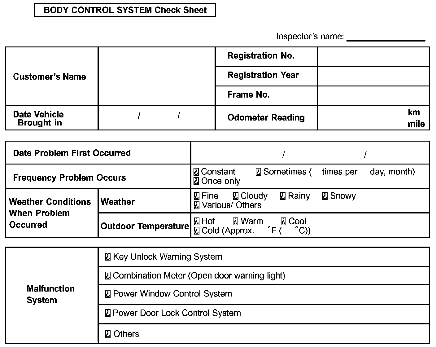 Body Control System Check Sheet: