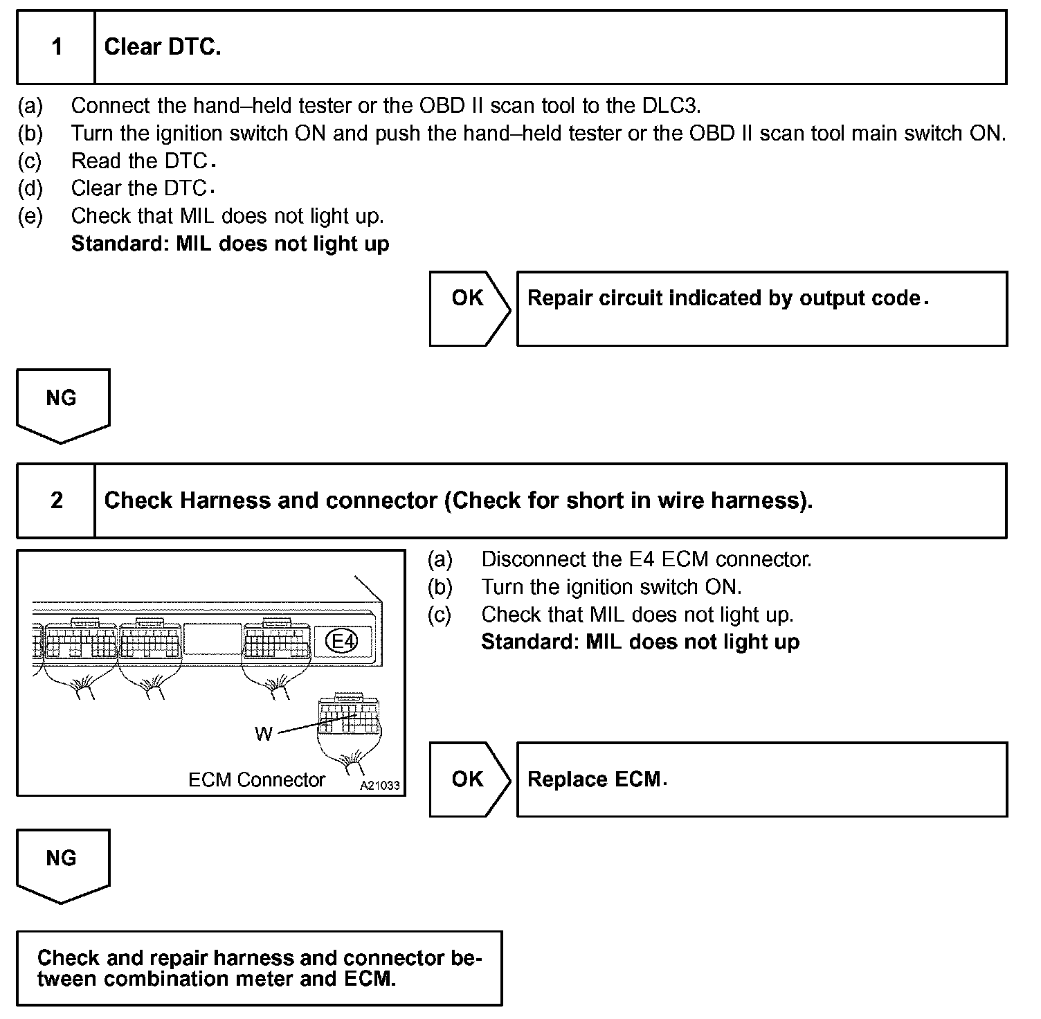 If the ECM detects a trouble, the MIL lights up. At this time, the ECM records a DTC in the memory.