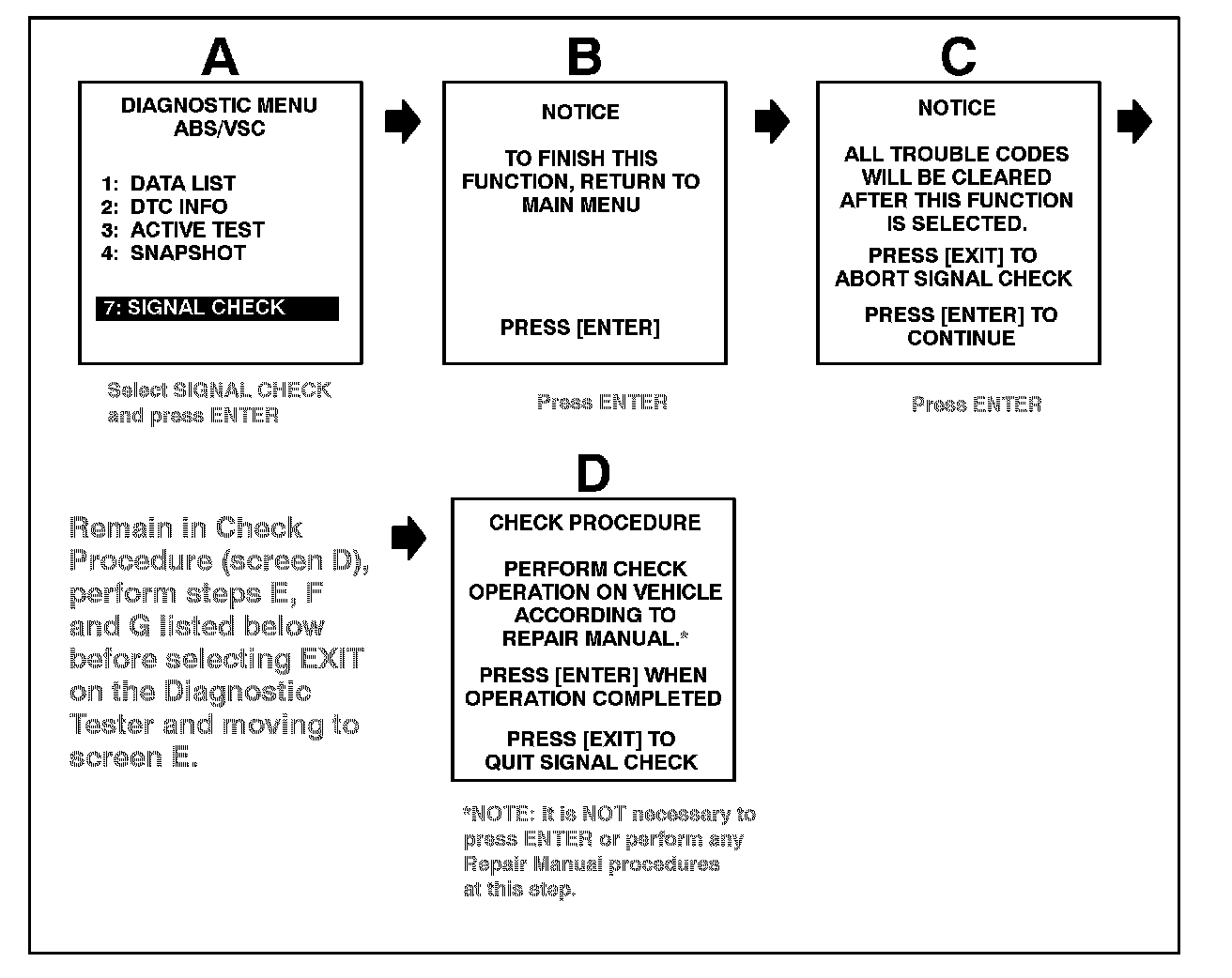 D. Place the Diagnostic Tester into Signal Check mode under the ABS/VSC menu.