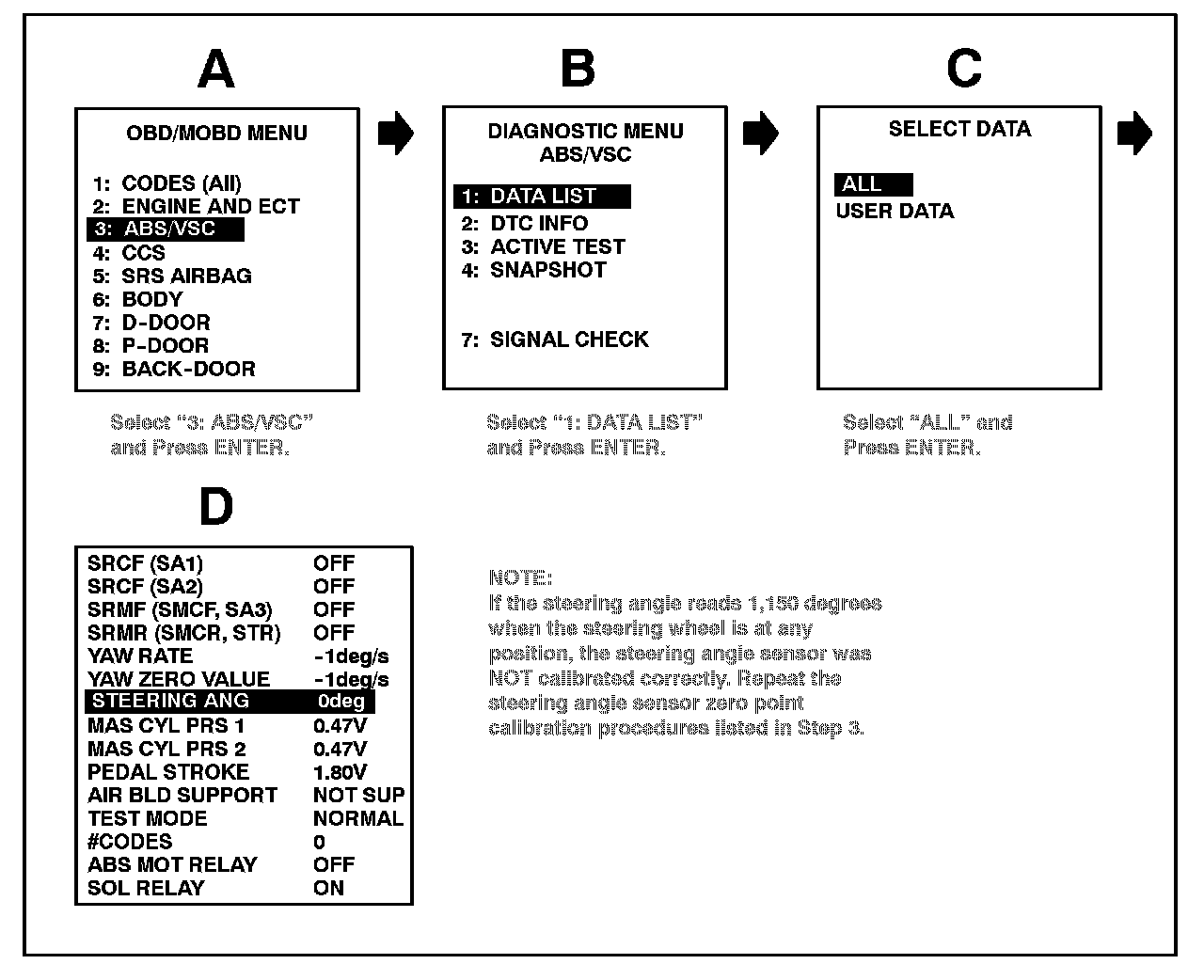 D. View the ABS/VSC Data List to see that the steering angle value changes when turning the steering wheel.