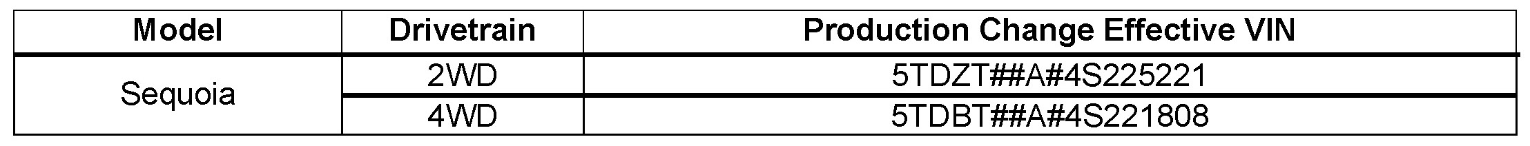 - 2001 - 2004 model year Sequoia vehicles produced BEFORE the Production Change Effective VINs shown below.