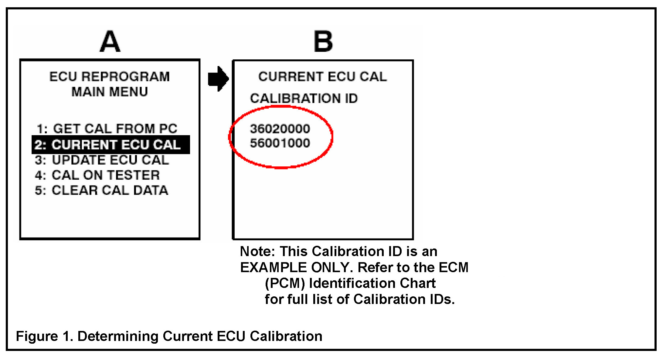 2. Connect the Diagnostic Tester to the vehicle and select "CURRENT ECU CAL" from the "ECU REPROGRAM MAIN MENU." To determine the vehicle's current ECM calibration, Figure 1 shown.