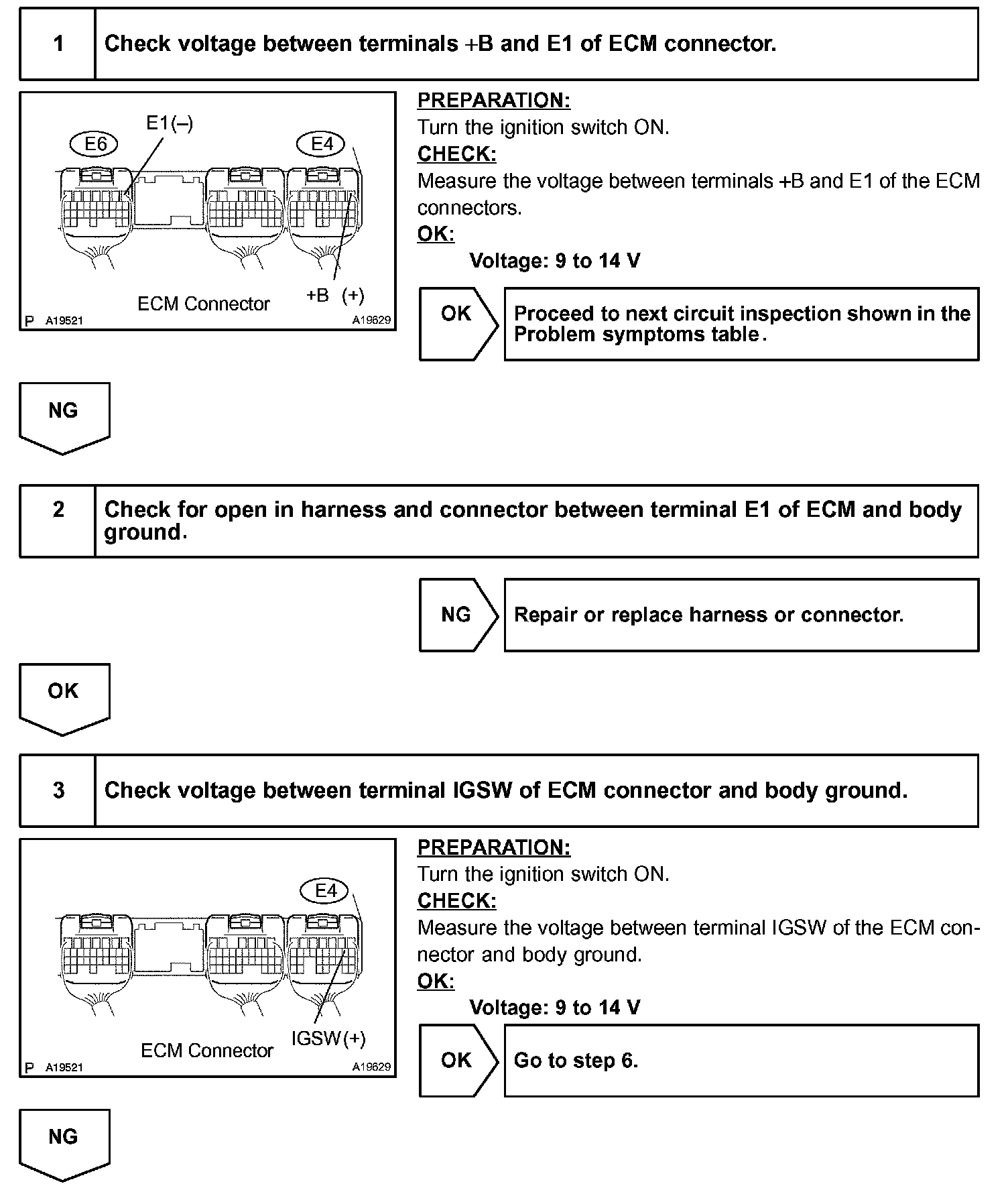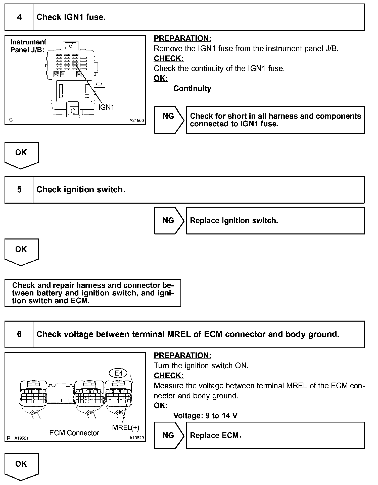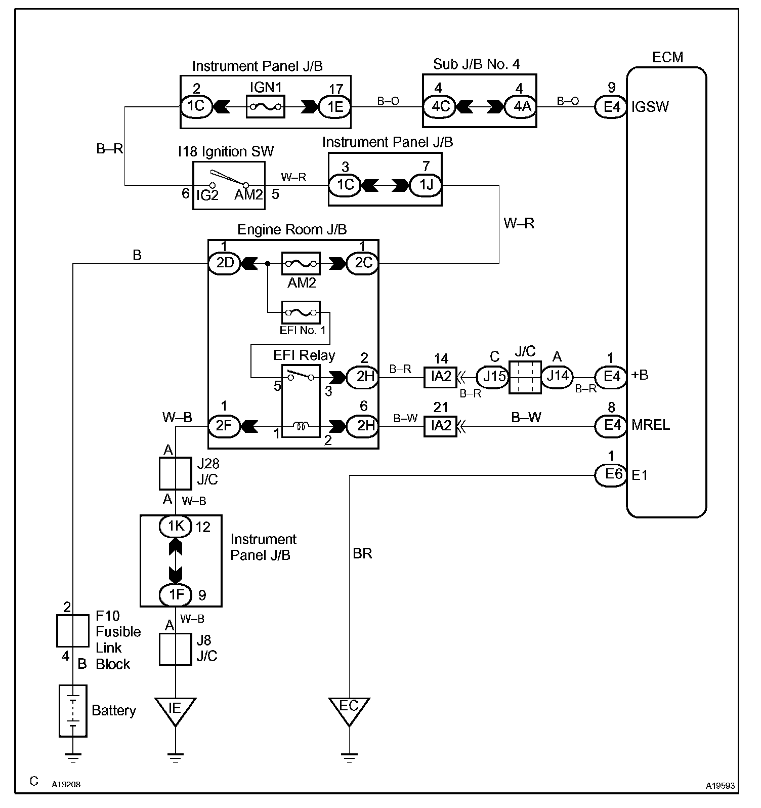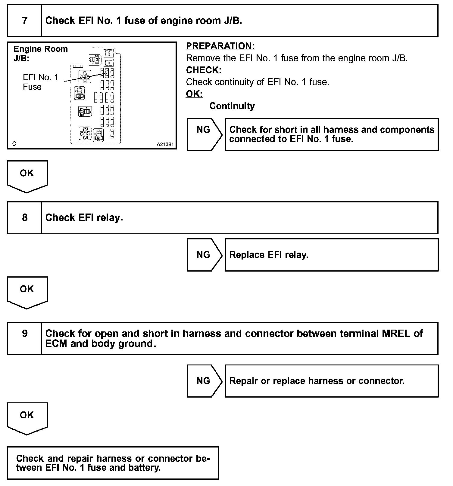 This signal causes current to flow to the coil, closing the contacts of the EFI relay and supplying power to terminal +B of the ECM.