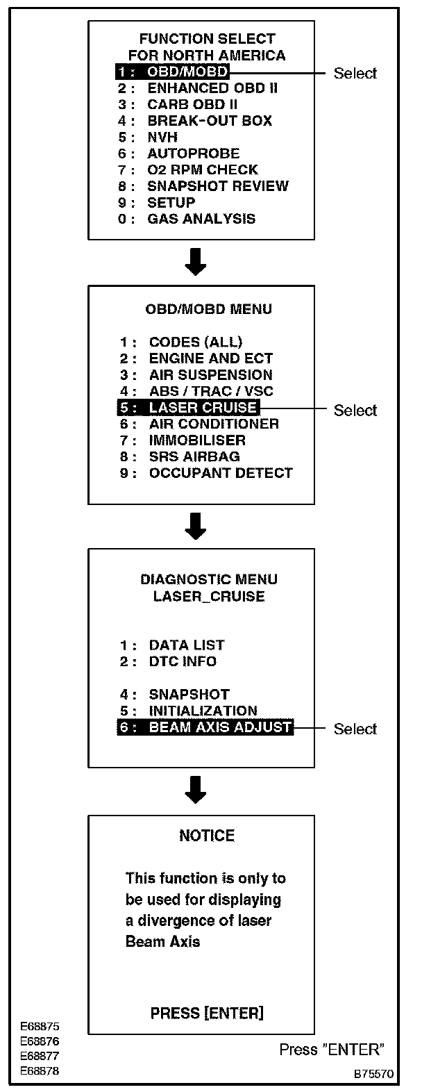 - Pressing "ENTER" will make the ECM transfer to BEAM AXIS ADJUSTMENT MODE.