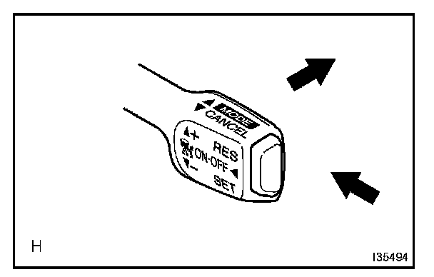 b. After pressing on the main switch of the cruise control main switch, press the cruise control main switch towards the MODE position for at least 1 second without any other control. After no indication is shown in the display, make sure that "NORM. (set vehicle speed)" is indicated.