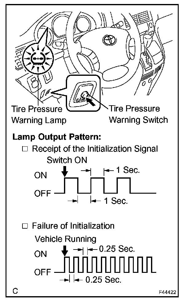HINT: If the tire pressure warning lamp blinks at 0.25 second intervals while the vehicle is being driven, the initialization may be failed, so perform the initialization again. (Turn the ignition switch OFF and retry from step 5-(b).)