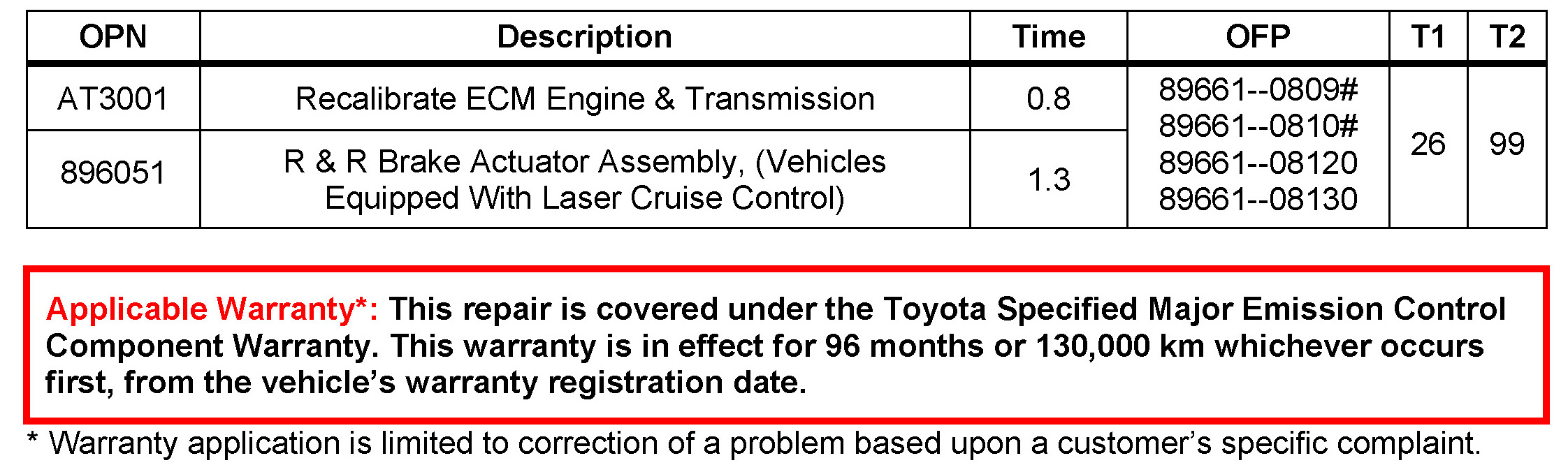 - July 15, 2005: The following changes have been implemented since first publication: 2005 model year Sienna vehicles added to Applicable Vehicles. Introduction and Note updated. New part, Brake Actuator Assembly, added. Calibration Identification Chart updated to include 2005 model year Sienna calibration IDs. Repair Procedure expanded with instructions for vehicles with laser cruise control.