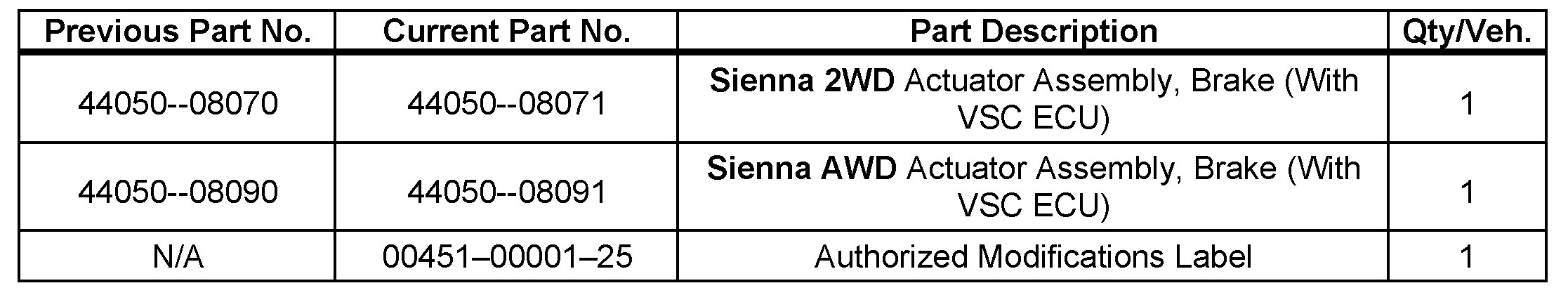 8. For 2004 model year vehicles equipped with laser cruise control, a new Brake Actuator Assembly (with VSC ECU) must be installed at the time of recalibration. If vehicle is equipped with laser cruise, use the Parts Information table to order the correct part (2WD or AWD) and follow the instructions listed on ETAS: 2004 model year Sienna Repair Manual: Brake: ABS & Traction Actuator Assy: Replacement to replace the Brake Actuator Assembly (with VSC ECU).