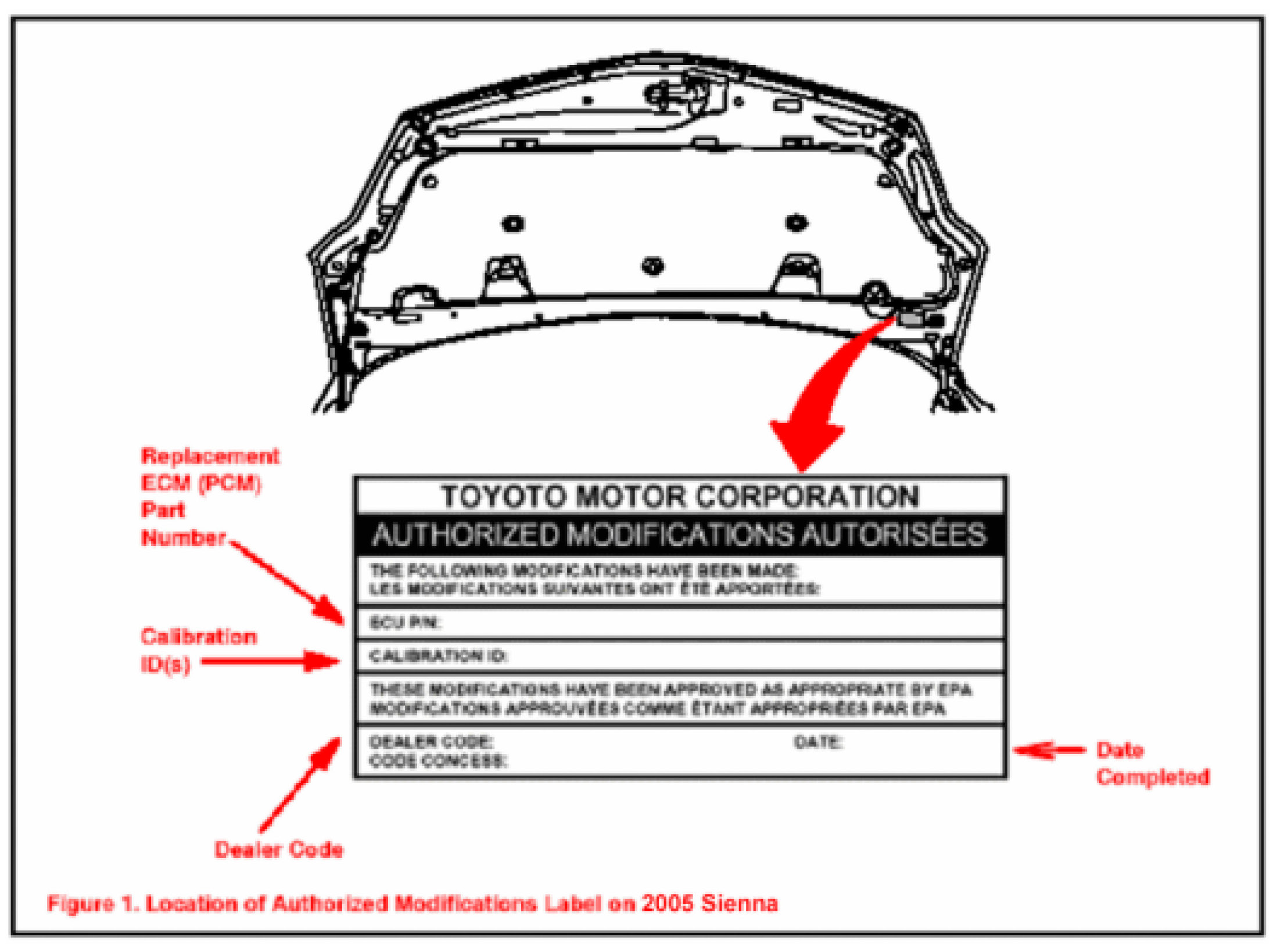 1. Check for the Authorized Modifications Label affixed to the vehicle in the location shown in Figure 1. Confirm if ECM (PCM) calibration has been updated. If not latest ECM (PCM) calibration - go to step 2.
