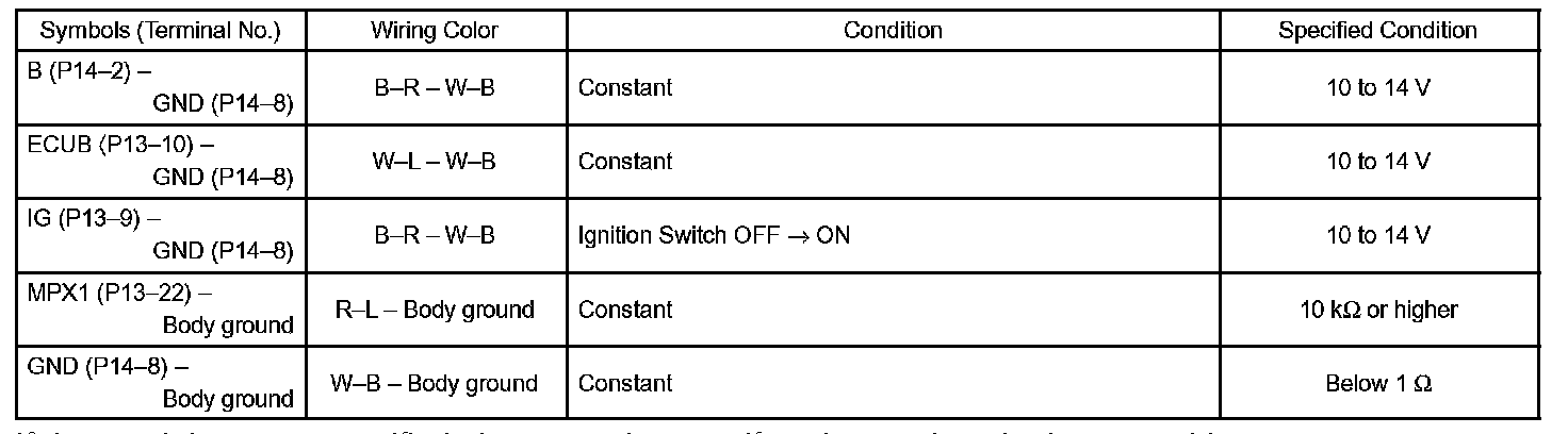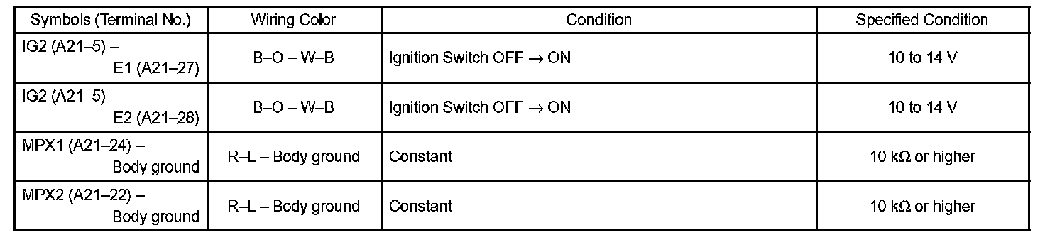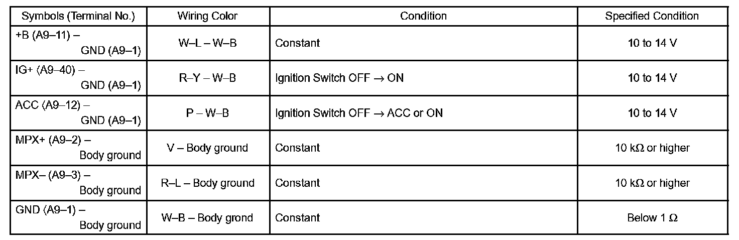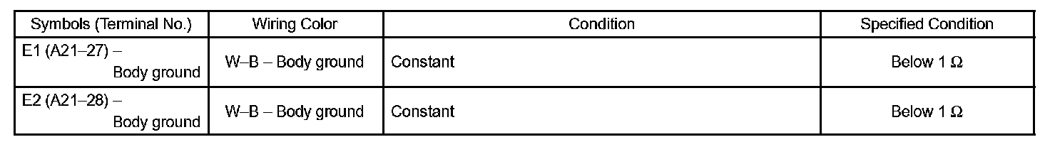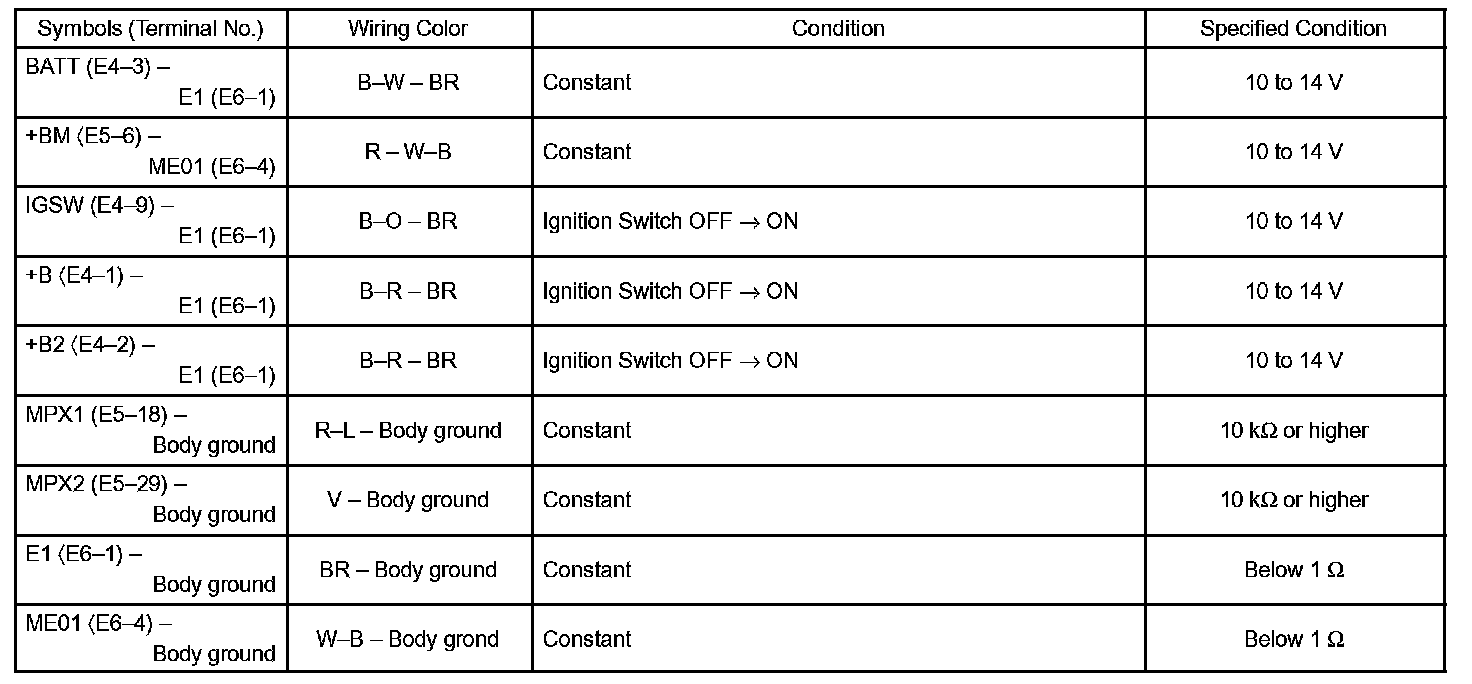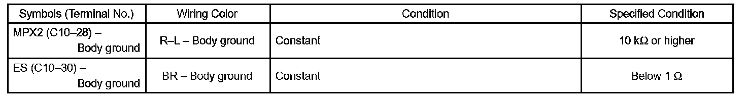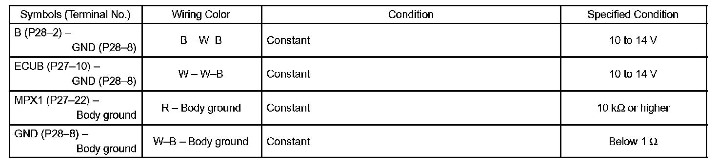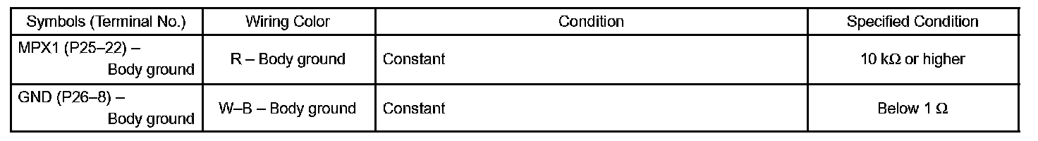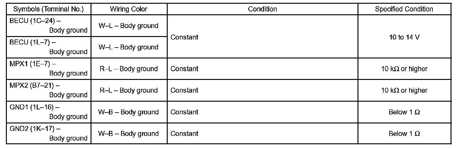 b. Check the voltage and resistance between each terminal of the wire harness side connectors and body ground.