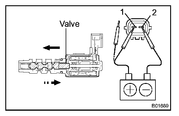 1. Connect the positive (+) lead from the battery to terminal 1 and negative (-) lead to terminal 2, and check the movement of the valve.