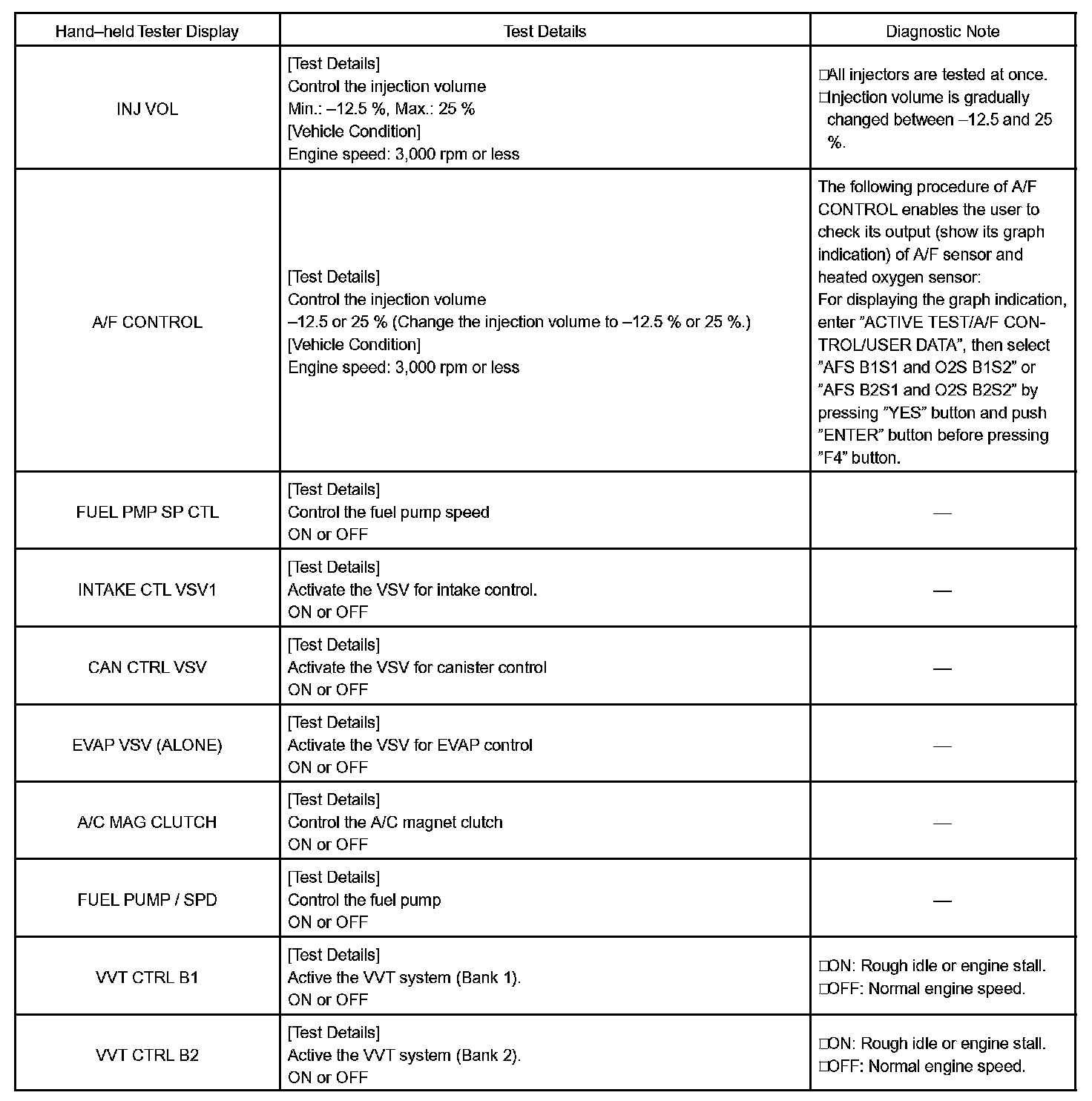 ACTIVE TESTHINT: Performing the ACTIVE TEST using the hand-held tester or the OBD II scan tool allows the relay, VSV, actuator and so on to operate without parts removal. Performing the ACTIVE TEST as a first step of troubleshooting is one of the methods to shorten the diagnostic time.