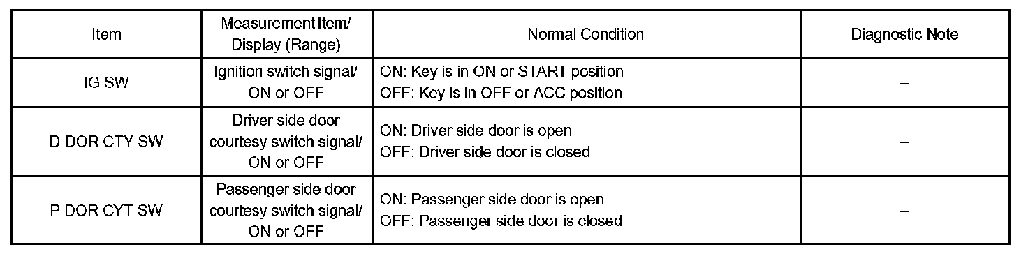 DATA LISTHINT: Using the DATA LIST displayed by the hand-held tester, you can read the value of the switch, sensor, actuator, etc. without parts removal. Reading the DATA LIST as the first step of troubleshooting is one way to shorten the labor time.