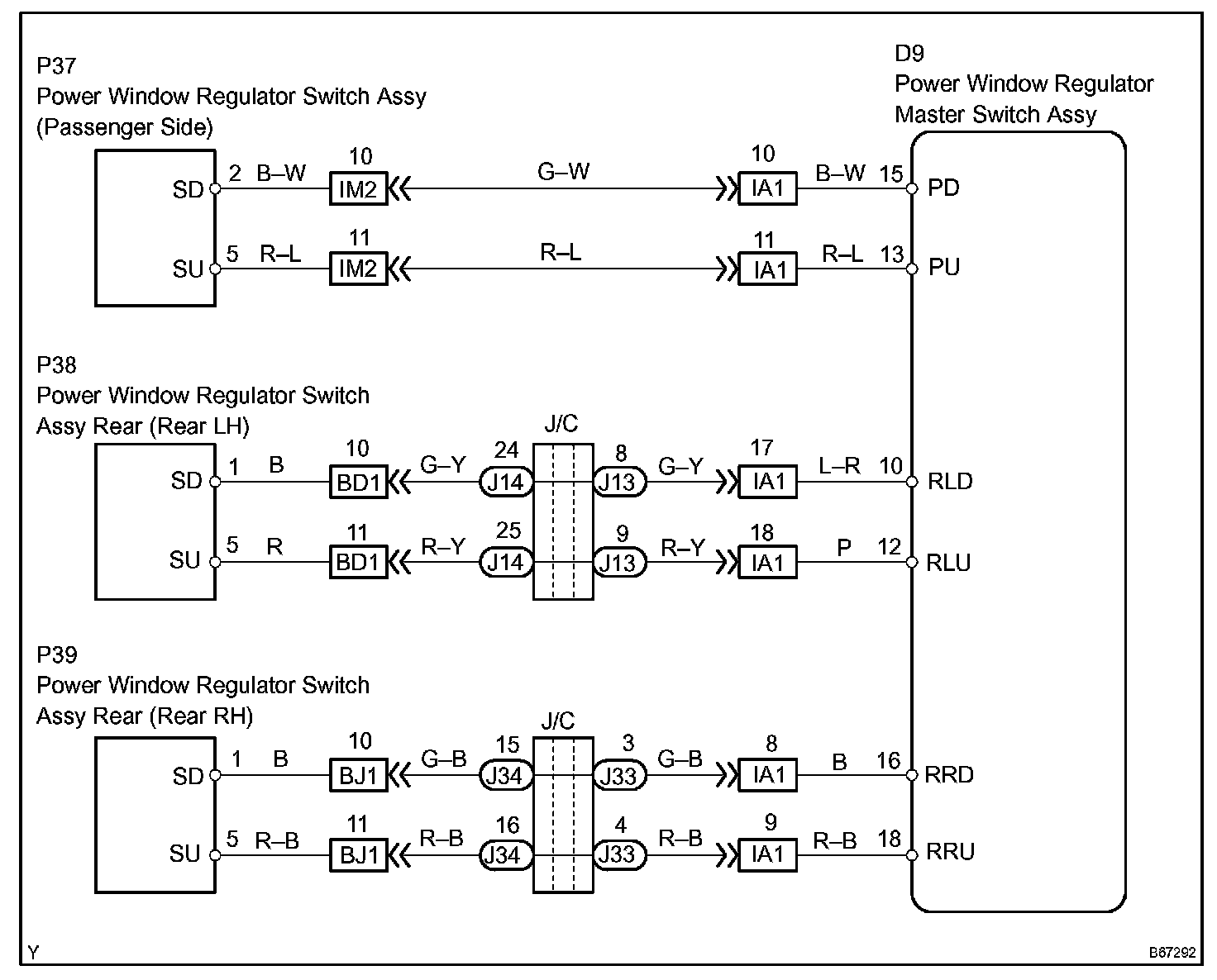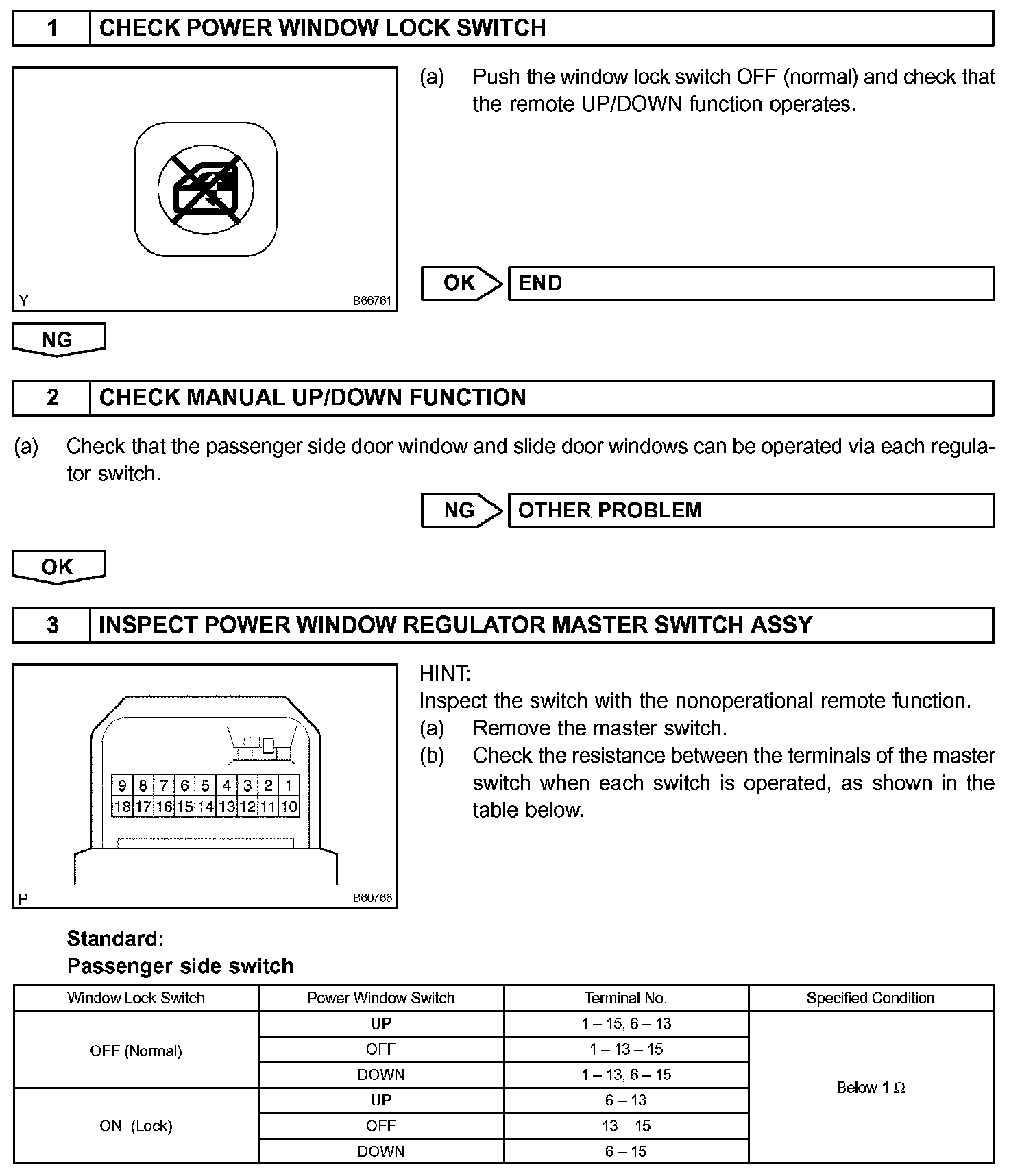 - There is an open or short circuit in the wiring between the power window master switch and the applicable power window regulator switch.