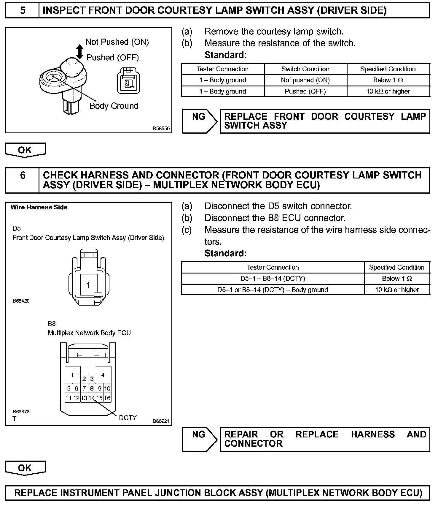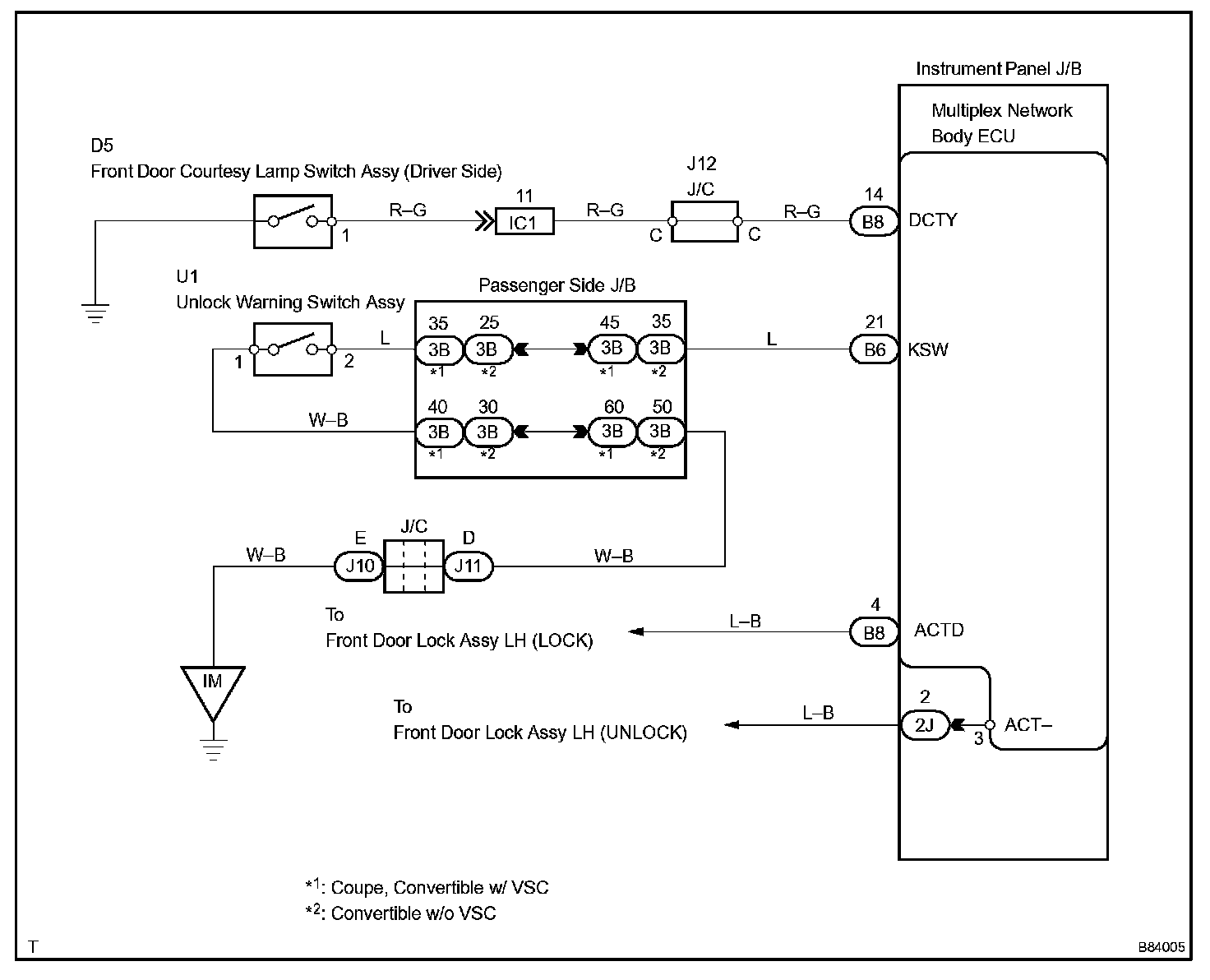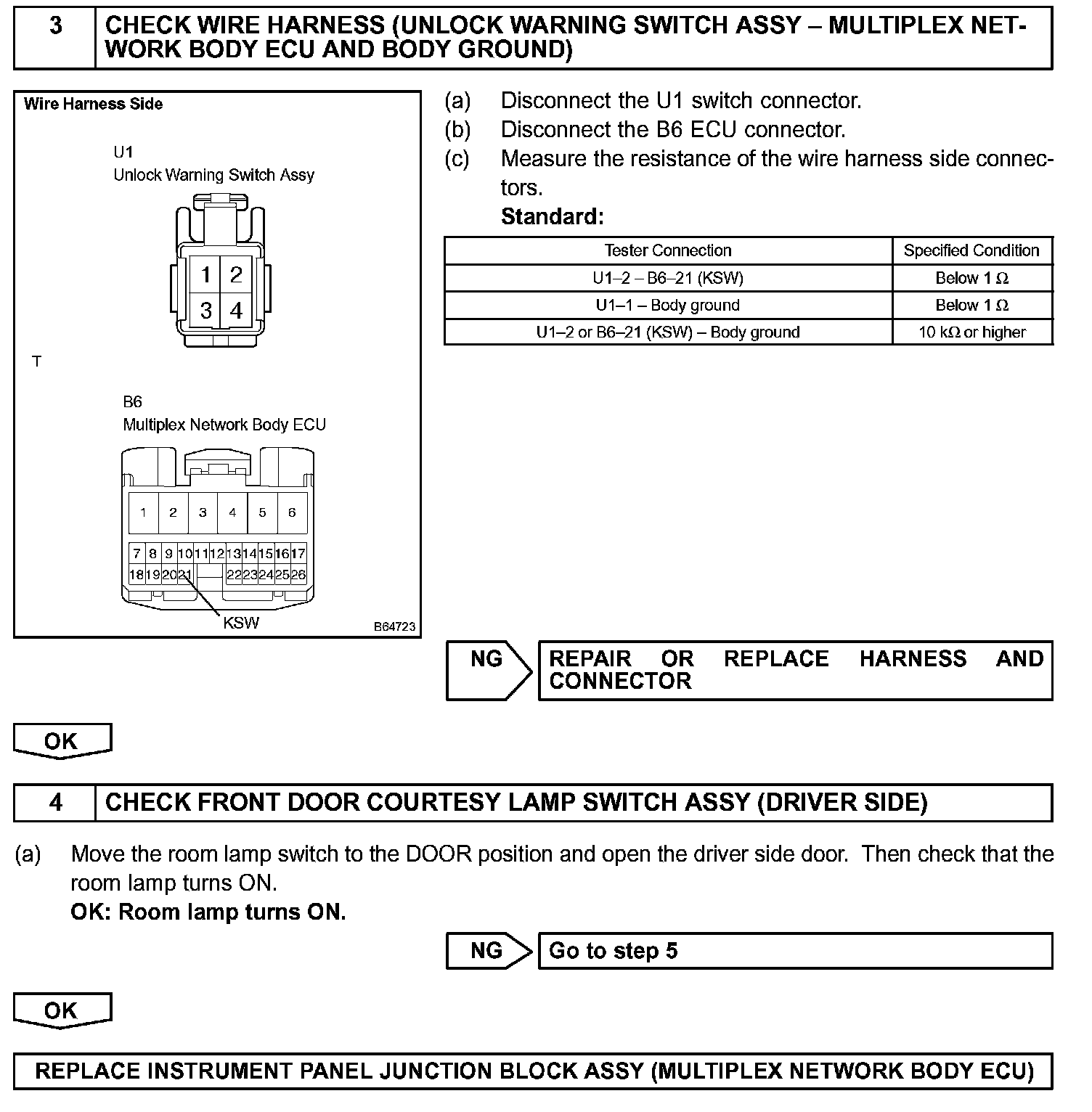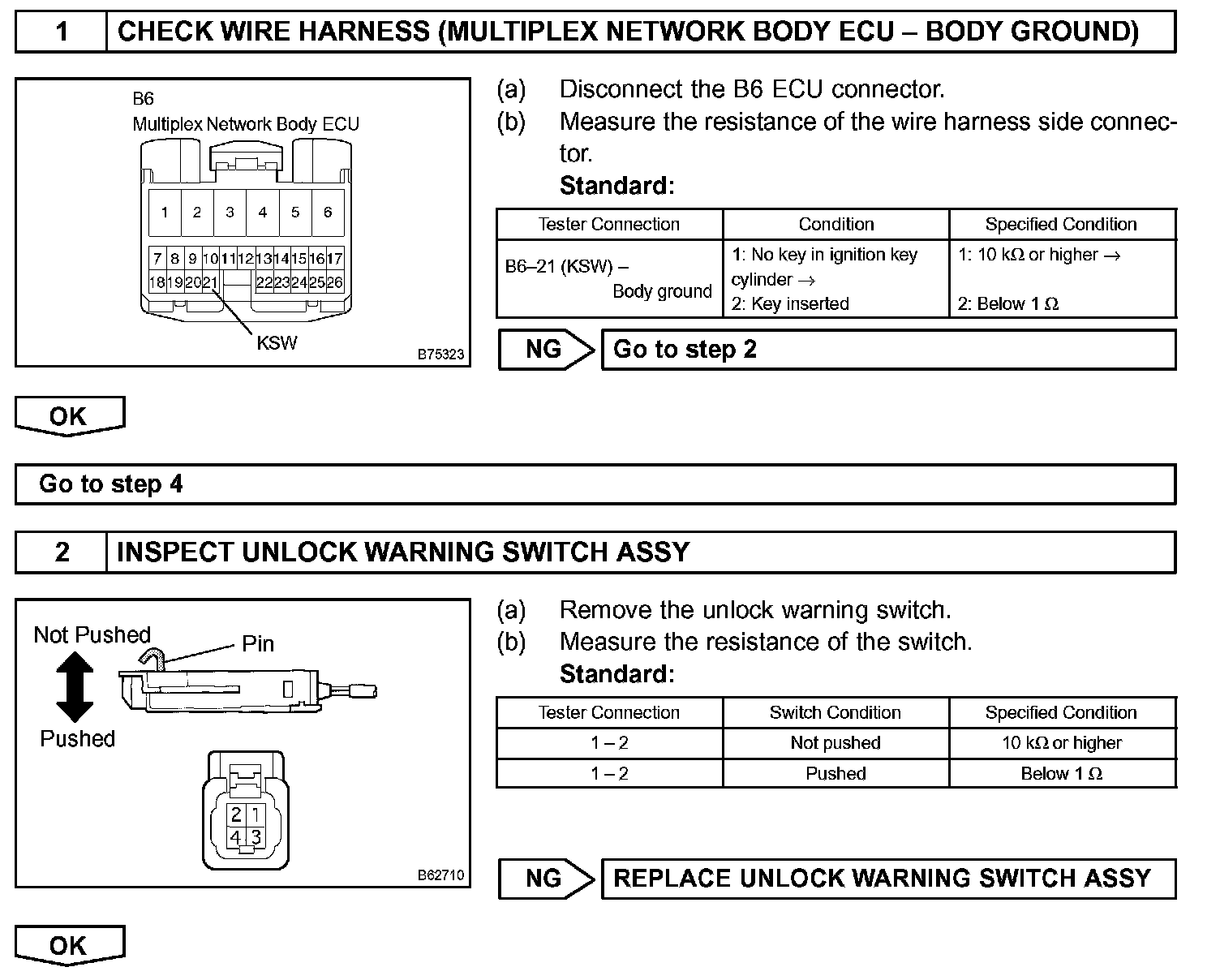 To prevent the key from being locked in the vehicle, the body ECU prevents doors from being locked by monitoring 2 switches: 1) the unlock warning switch, which turns ON when the key is inserted into the ignition key cylinder; and 2) the driver side courtesy lamp switch, which turns ON when the driver side door is opened.