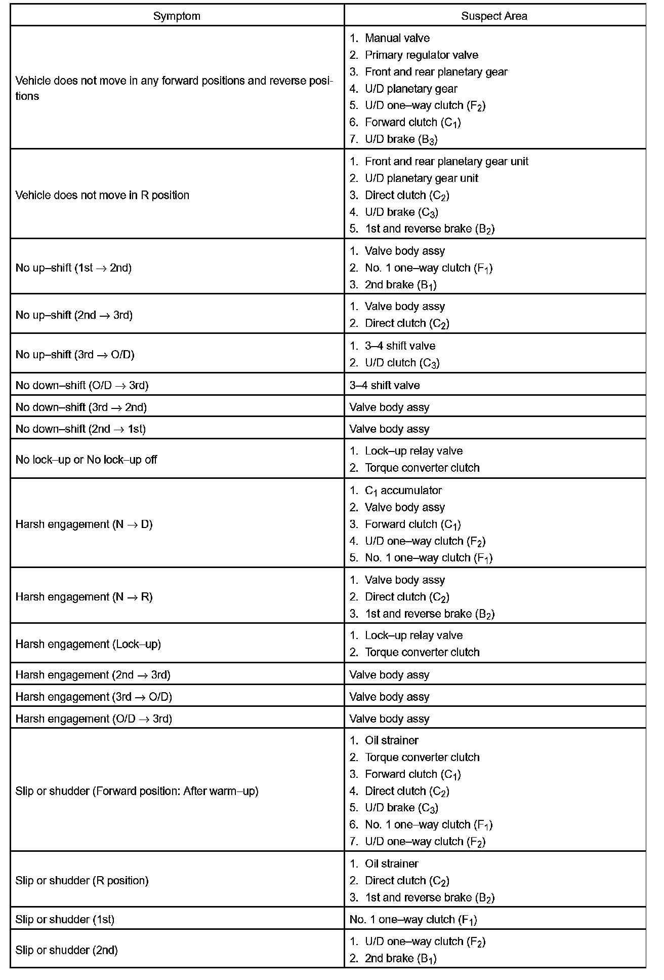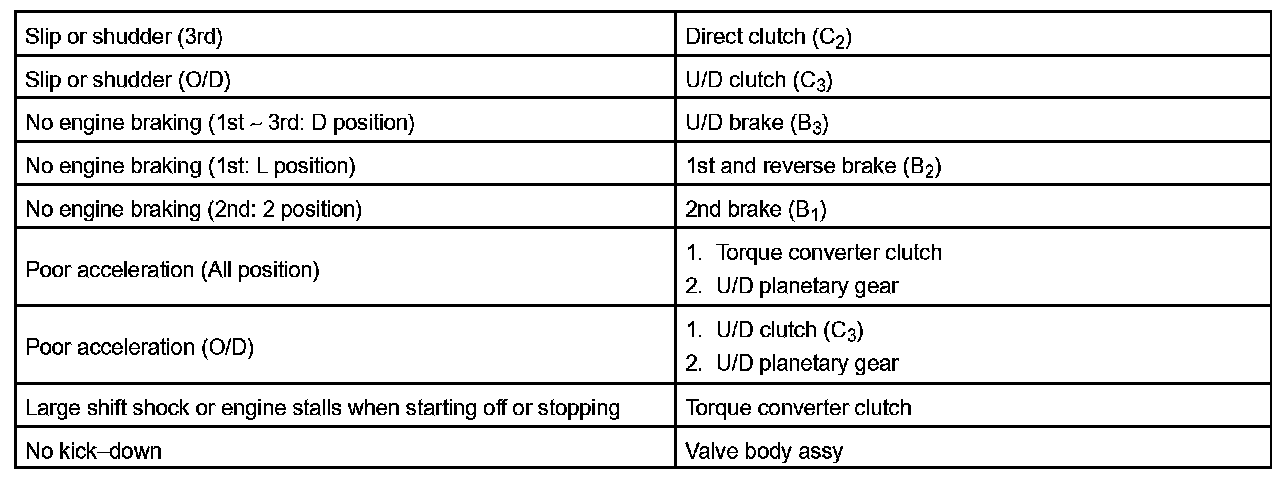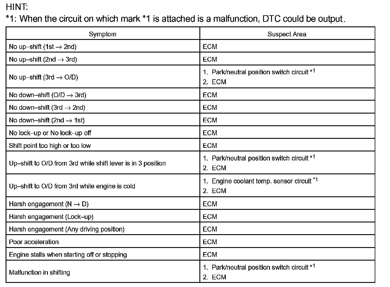 PROBLEM SYMPTOMS TABLEHINT: If a normal code is displayed during the diagnostic trouble code check although the trouble still occurs, check the electrical circuits for each symptom in the order given in the charts and proceed to the troubleshooting.