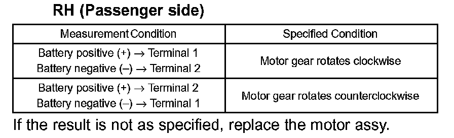 If the result is not as specified, replace the motor assembly.