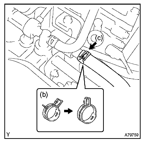 e. Lock the hose clamp as shown in the illustration. Then remove the water outlet together with the water by-pass hose No. 1.