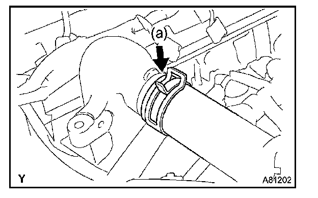 b. Install the water outlet together with the water bypass hose No. 1 and unlock the hose clamp.