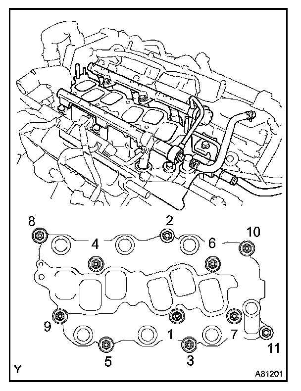 NOTE: Fully tightening one of these bolts or nuts without partially tightening the other bolts or nuts in the group may damage the intake manifold, bolts and nuts.