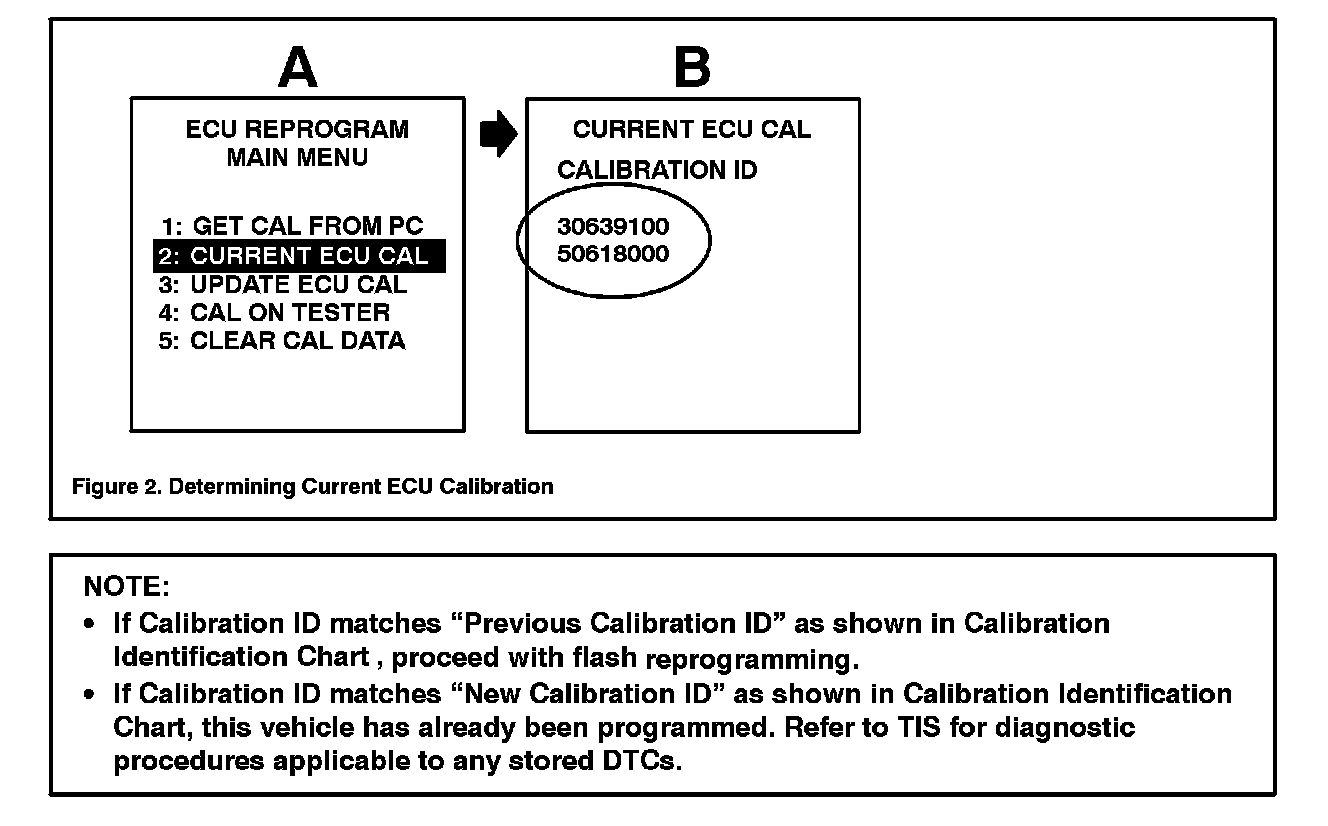 2. Connect the Diagnostic Tester to the vehicle and select CURRENT ECU CAL from the ECU REPROGRAM MAIN MENU. Determine the vehicle's current ECU calibration (see Figure 2).