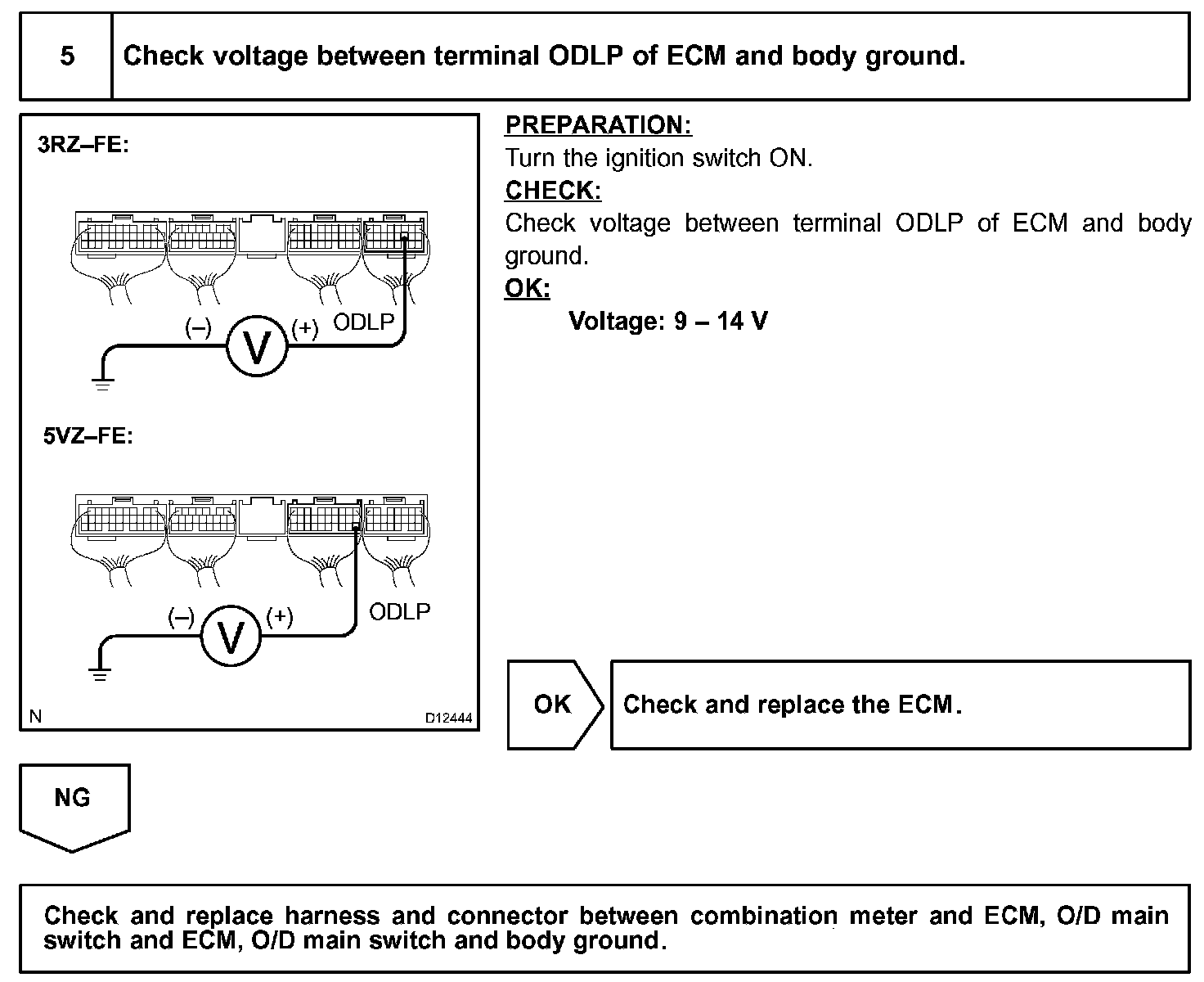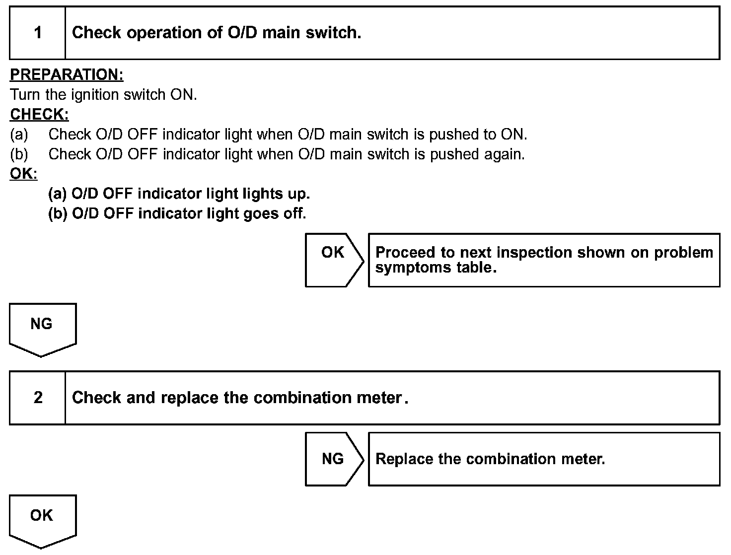 The O/D main switch is a momentary type switch. When pressing the O/D OFF main switch, the O/D OFF indicator light lights up and ECM prohibits shifting to O/D, and when pressing it again, the O/D OFF indicator light goes off and ECM allows shifting to O/D. Turning the IG switch OFF will reset the O/D OFF indicator light.