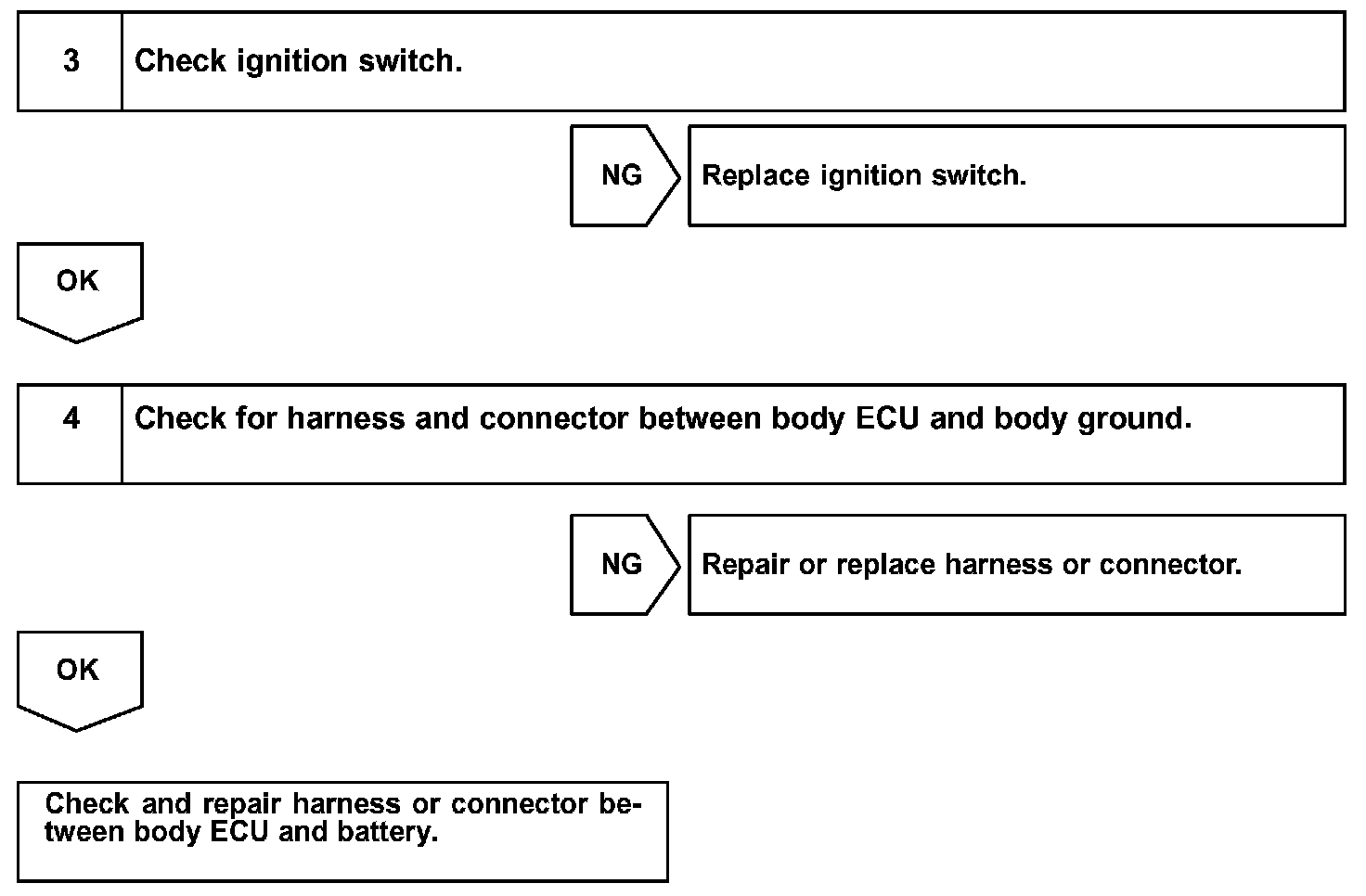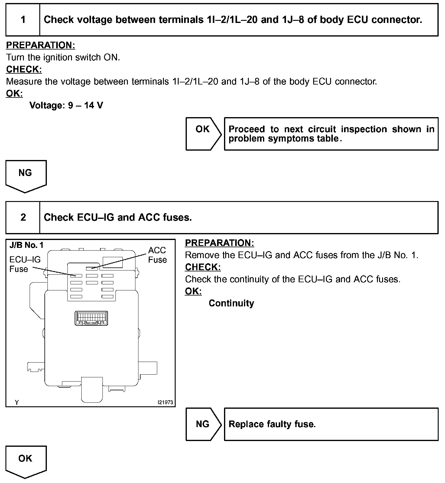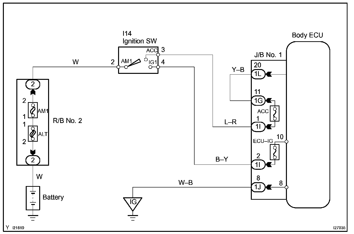 When the ignition switch is turned to the ON position, battery voltage is applied to terminal IG of the body ECU.
